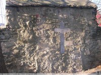 2 grudnia 2006 , Krzyż kamienny osadzony w murze otaczającym kościół św. Andrzeja Boboli w Mieczkowie. |