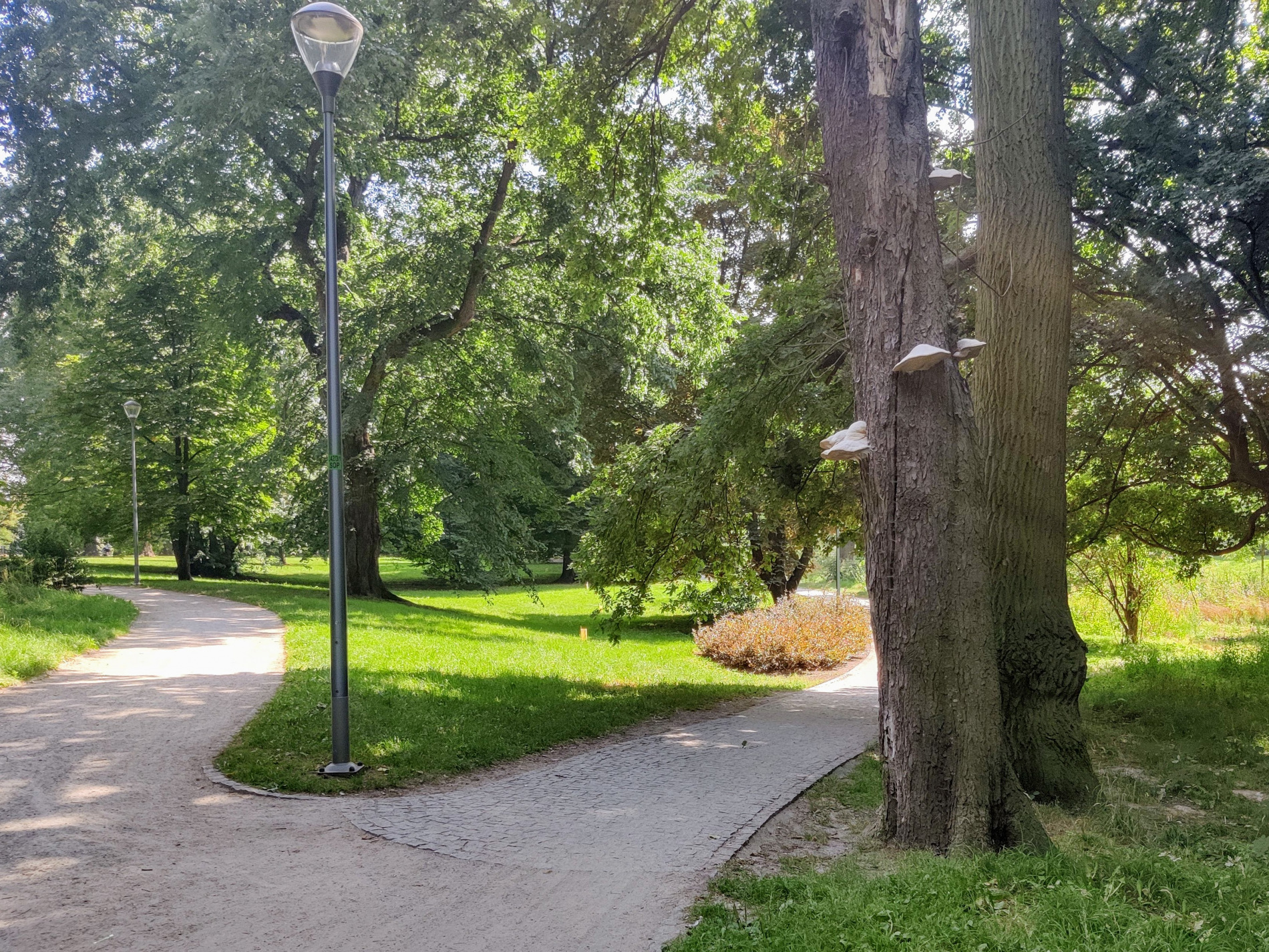 13 sierpnia 2021 , Rozwidlenie ścieżek w północno-zachodniej części Parku Klecińskiego. Na drzewie po prawej stronie widoczne spore grzyby - nie wiem jaki to gatunek, w każdym razie z grupy hub.Skomentuj zdjęcie |