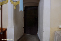 4 września 2021 , Wnętrze kościoła św. Wawrzyńca, który powstał w zaadaptowanym południowym skrzydle pałacu, a dawniej klasztoru w l. 1706-1711. Kościół jest budowlą jednonawową, krytą sklepieniem kolebkowym z lunetami. Budowla na planie prostokąta z niewyodrębnionym prezbiterium. Na zdjęciu boczne drzwi prowadzące z nawy do zakrystii, kaplicy pogrzebowej i na chór boczny.Skomentuj zdjęcie |