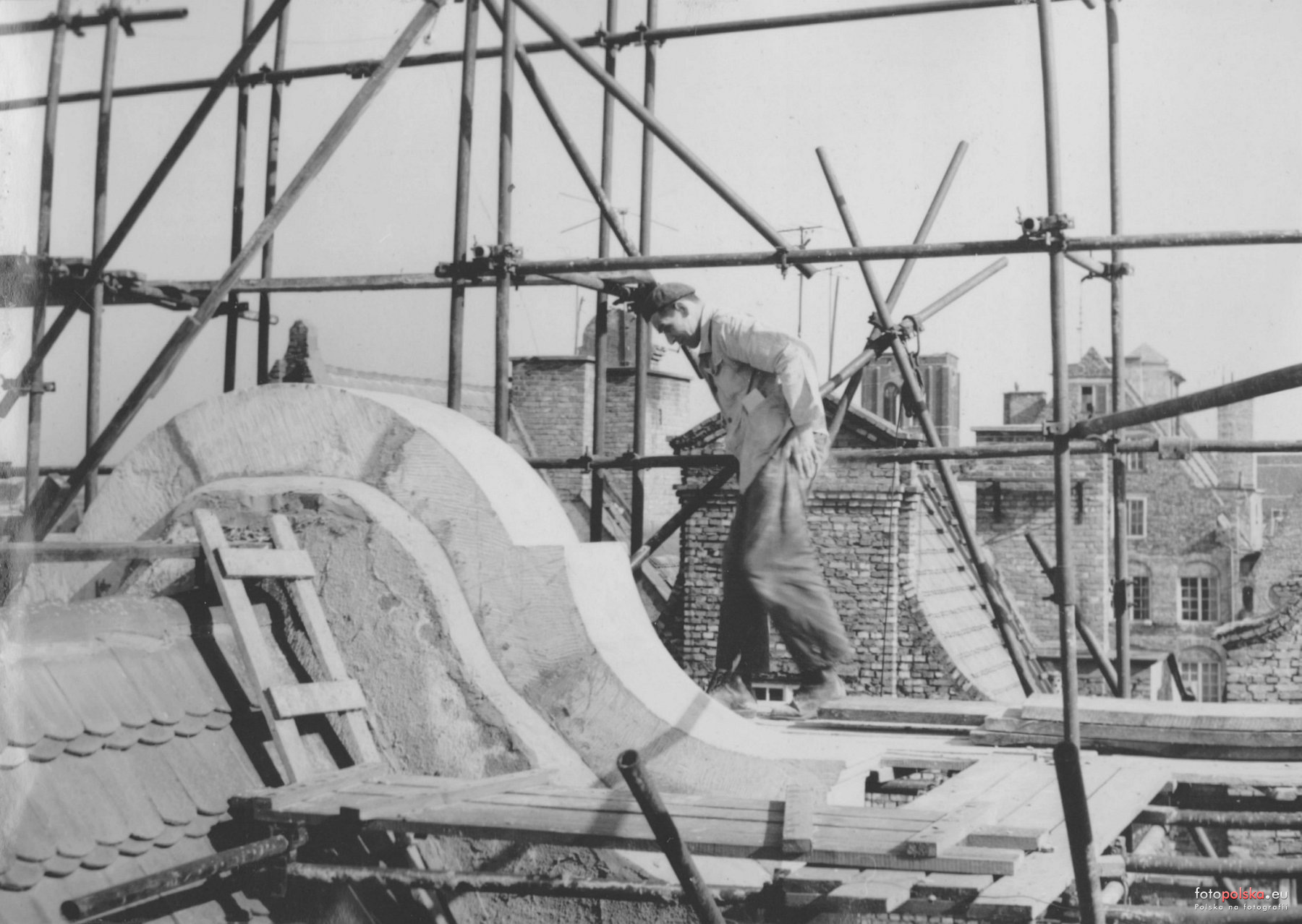 Lata 1960-1961 , Trwa odbudowa Głównego Miasta. Robotnik znajduje się na rusztowaniu przy kamienicy Mariacka 18. Za nim widoczne szczyty kamienic Mariacka 38 i 39, zaś głębiej na prawo widoczny fragment budynku przy ul. św. Ducha 109 znanego też jako Dom Żeglarzy. Widoczny jest także górny fragment wieży kościoła św. Jana.Skomentuj zdjęcie |