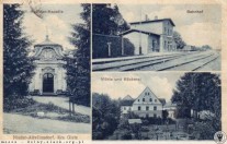 1934 , Przedwojenna pocztówka ze Starego Wielisławia przedstawiająca: Kaplicę husycką - Mauzoleum księcia Jana Ziębickiego, dworzec Kłodzko Zagórze, młyn i piekarnię.Skomentuj zdjęcie
