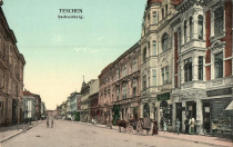 7 pobrań 988 odsłon 6 średnia ocen Poprzednie i następne zdjęcia Ewqa100 Obiekty widoczne na zdjęciu ul. Główna (Hlavní třída) więcej zdjęć (1258) Ulica powstała w 1775 r. (według kroniki Kaufmanna) i pierwotnie przypisana była do dzielnicy Kamieniec, a w późniejszym okresie również do Saskiej Kępy, czyli Brandysa, gdyż areał Saskiej Kępy został wydzielony z Brandysa. Początkowo w miejscu tym biegła aleja topolowa z nieliczną jeszcze podmiejską zabudową. Jej pierwotna nazwa brzmiała Cesarska Droga - Kaiserstrasse. Po 1790 r. nazwę zmieniono na Droga Rzeszy - Reichs Strasse (stosowano również zamiennik Aerarial-Straße lub Ärarialstraße, co innymi słowy oznaczało drogę państwową), zaś przed 1883 r. na Saska Kępa - Sachsenbergstrasse, lub Sasówka z racji budowy w tym miejscu 13 manufaktur sukienniczych (a także tzw. wałchownię, czyli folusz do spilśniania wełny) przez ówczesnego właściciela Księstwa Cieszyńskiego księcia Albrechta Sasko-Cieszyńskiego, które jednak nie działały zbyt długo. W 1889 r. pojawia się też nazwa, a w zasadzie określenie ulicy, jako ul. Główna, czyli Hauptstrasse. Droga ta nie była własnością miasta - należała do państwa, czyli tzw. Ärarialstraße. Ciąg budynków powyżej skrzyżowania z obecną ul. Ruchu Oporu, w tym również wzdłuż ul. Frydeckiej, nazywano w księgach gruntowych: Colonie Sachsenberg. Wyraz - Kępa - oznaczał, iż droga była usytuowana wyżej aniżeli okoliczne pola i budynki. Zapewne z tego właśnie powodu polska gazeta Gwiazdka Cieszyńska pierwotnie określała ją mianem - Saska Góra. Powodem takiego stanu rzeczy była m.in ochrona drogi przed niszczącymi wylewami rzeki Olzy oraz wysokość jezdni mostu przeciw-zalewowego , z którym droga była połączona. Zabudowania zlokalizowane wzdłuż drogi odgradzały szerokie na 3m i głębokie ponad 1m rowy melioracyjne z wysokimi kamiennymi słupkami, które w późniejszym okresie zasypano. Droga w owym czasie była około 16.5m szeroka. Do budynków wchodziło się mostkami, które były bardzo podobne do tych w okolicach Cieszyńskiej Wenecji - ul. Przykopa. W 1880 r. żądano podwojenia ilości oświetlenia ulicznego aż po dworzec kolejowy przy ul. Jabłonkowskiej. W 1883 r. rozpoczęto gruntowną regulację ulicy wraz z budową chodników w miejscu skanalizowanych rynsztoków (zamiary te były omawiane na posiedzeniach już w 1882 r.), jednak jeszcze w 1885 r. ulica ta nie była całkowicie pokryta chodnikami. Powodem miały być trudności z niektórymi właścicielami budynków, którzy nie chcieli za zbyt niską cenę odstąpić części działek pod budowę chodnika. Dotyczyło to m.in. posiadłości Lehmanna (numer konskrypcyjny 34 i 35), z którym pertraktowano jeszcze w 1886 r. W 1889 r. skarżono się jak co roku na niewystarczające oświetlenie ulic. Według opinii brak oświetlenie powodował wielorakie niedogodności, ale czasami również nieprzyjemne wypadki. Za przykład podawano kobietę i jej dziecko, które wpadło do rowu wypełnionego wodą i błotem na przeciwko domu Hoheneggera. W 1891 r. drogę walcowano - utwardzono tłuczniem. W 1900 r. poszerzono (3,5 m) i wybetonowano chodniki, natomiast drogę wybrukowano. Brukowanie kostką Porphyrwürfel - magmowa skała Porfir - kosztowało 62 tys. florenów i wykonała je firma Kulka z Opawy. Rozważano również wariant z nawierzchnią asfaltową w czym specjalizowała się wiedeńska firma Asphalt-Actien-Gesellschaft. W tym wypadku koszt byłby 47 449 florenów. Następnym wariantem była kostka granitowa, którą dostarczyłaby wiedeńska firma Scheffel za 53 tys. florenów oraz kostka metalowa od firmy Schostal & Co z Brna za 48 tys. florenów. W wyniku poszerzenia chodników przeniesiono również latarnie uliczne, które odtąd znajdowały się na chodniku. Na uregulowanie całej ulicy czekano długie lata, przy czym często skarżono się na stan drogi i chodników, które podczas deszczu zamieniały się w błoto. Do 1900 r. ludność korzystała wyłącznie z lewego chodnika, który powstał w 1888 r. (strona drukarni), gdyż po prawej stronie istniały tylko jej fragmenty z odmienną szerokością i wysokością. W 1894 r. przeprowadzono prace ziemne związane z budową wodociągu miejskiego. W 1917 r. przygotowano projekt przebudowy, który miał polegać na obniżeniu nawierzchni drogi. Za początek obniżenia wyznaczono skrzyżowania z Mervillegasse. Obniżona droga miała umożliwić przejazd tramwaju przez nowe przejście podziemne, które miało zastąpić tzw. Demelloch . Chodniki miały pozostać na pierwotnej wysokości, natomiast zejście na drogę miały umożliwiać schody. Saska Kępa była jedną z najważniejszych dróg przelotowych w Cieszynie. Na jednej z licznie wydawanych pocztówek oznaczona została jako Grand Avenue. Na swym końcu rozgałęziała się w trzech kierunkach: na Węgry, Morawy i Śląsk Opawski. Po 1924 r. rozpoczęto sukcesywne usuwanie z nawierzchni szyn tramwajowych, co miało mieć związek z nowym brukowaniem ulicy (fragmentarycznie istniały jeszcze w 1933 r.) dochodziło bowiem do licznych wypadków rowerzystów. W 1928 r. zainstalowano nowe oświetlenie uliczne - lampy elektryczne zawieszone na dużej wysokości pomiędzy kamienicami. W 1929 r. pokryto asfaltem chodniki wzdłuż drukarni Prochaski. W grudniu tego samego roku radny Jan Blecha proponował ustawić policjanta kierującego ruch drogowy na skrzyżowaniu Saskiej Kępy z ul. Hasnera. W wyniku rosnącego ruchu samochodowego ograniczono w 1930 r. prędkość do 15 km/h, przy czym na skrzyżowaniu z ul. Dworcową pojawiła się dwujęzyczna tablica: Pomalu jezdit! Langsam fahren! W następnym roku zakupiono skrapiarkę ulic, by ograniczać w ten sposób tumany prochu (skrapiarki były stosowane już pod koniec lat 80 XIX w.). W czerwcu 1931 r. kładziono kabel telefoniczny z nowego budynku poczty przy ul. Dworcowej do polskiej części m