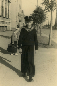 Lata 1946-1949 , Uczeń szkoły podstawowej przed budynkiem poczty.Skomentuj zdjęcie |