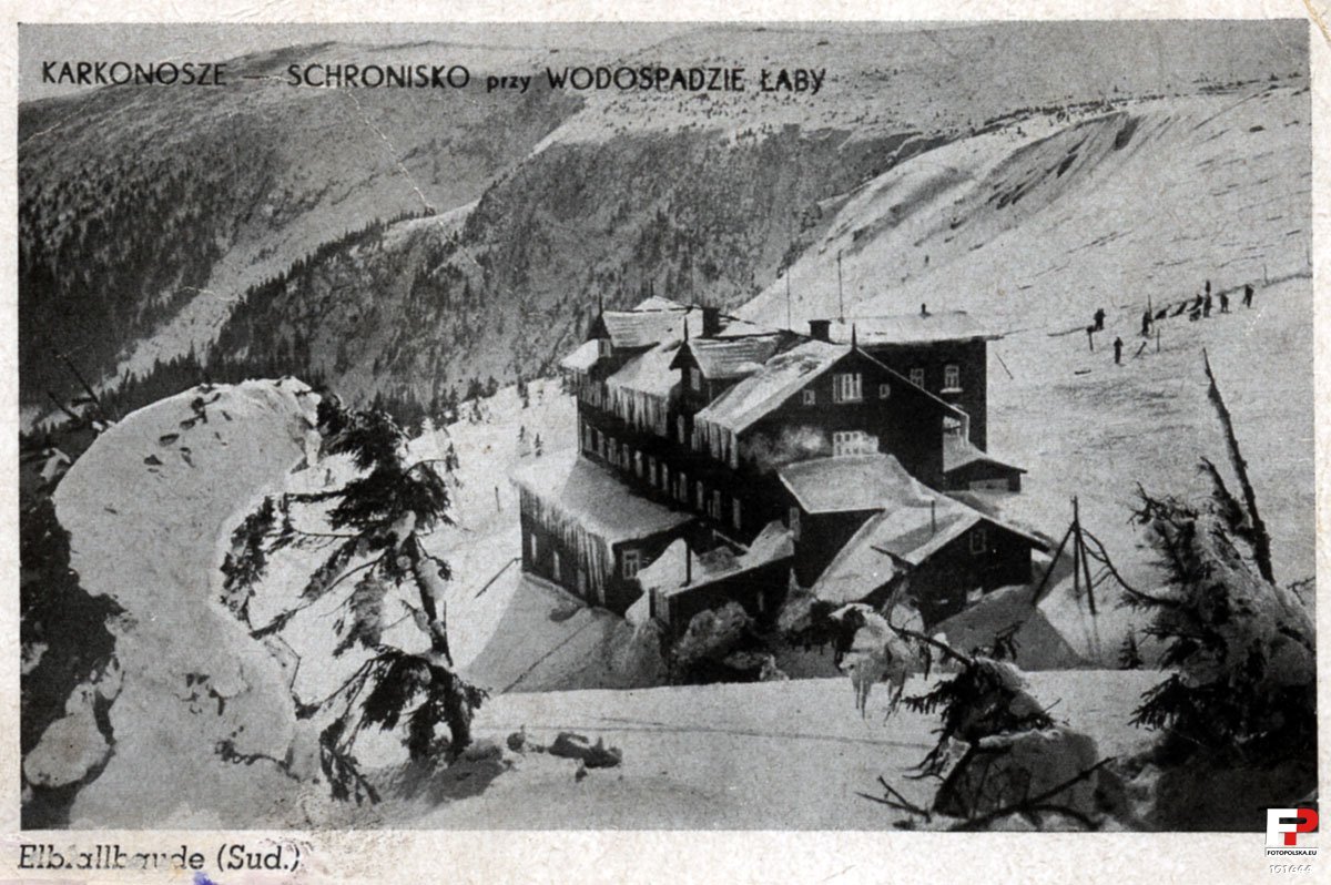 Lata 1930-1944 , Schronisko przy wodospadzie Łaby - Elbfallbaude. Pocztówka przedwojenna z powojennym polskim nadrukiemSkomentuj zdjęcie