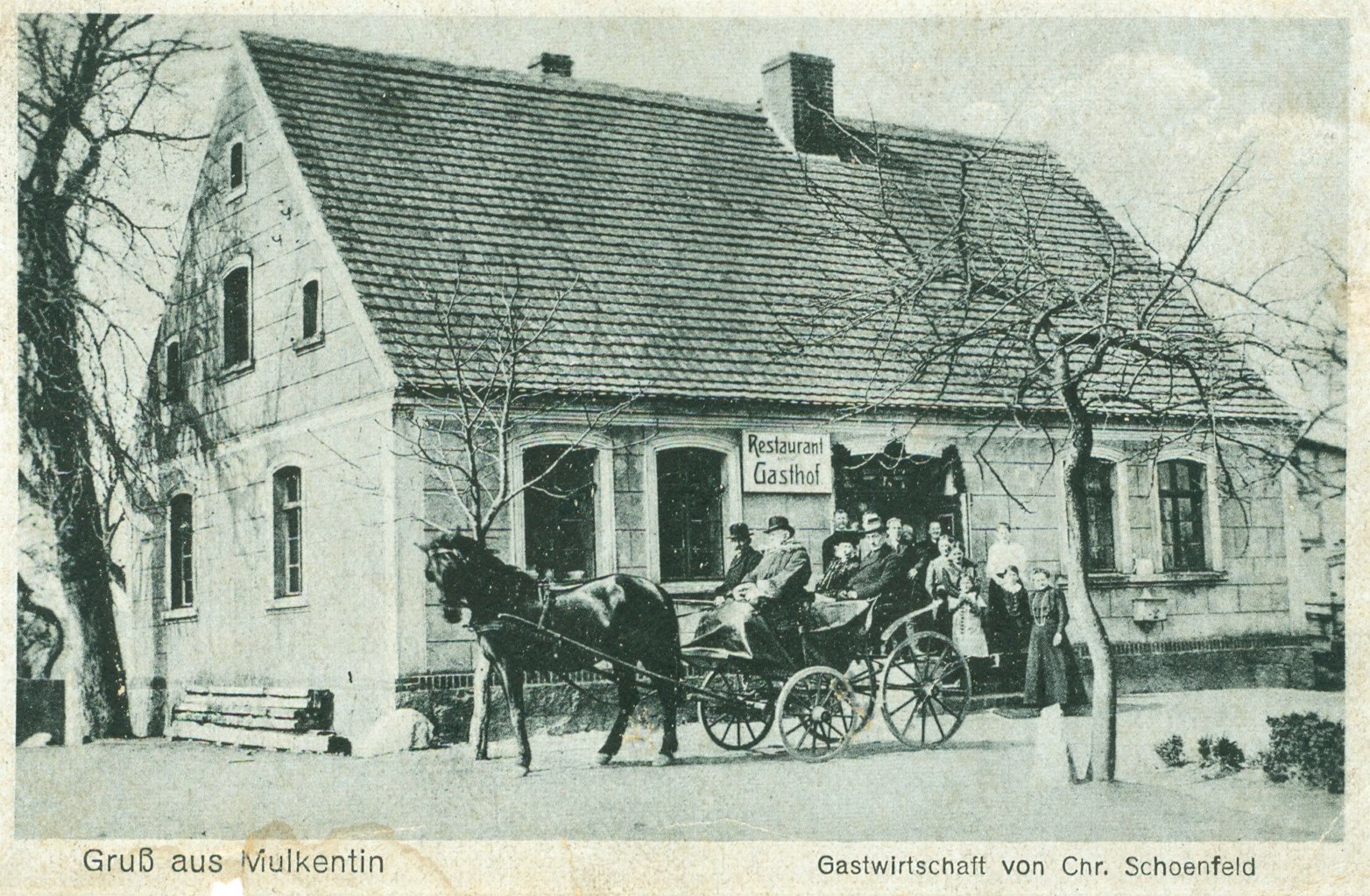 1922 , Bryczka z pasażerami przy zajeździe C. Schoenfelda w Małkocinie (Mulkenthin), pocztówka z ok. 1922 rSkomentuj zdjęcie |