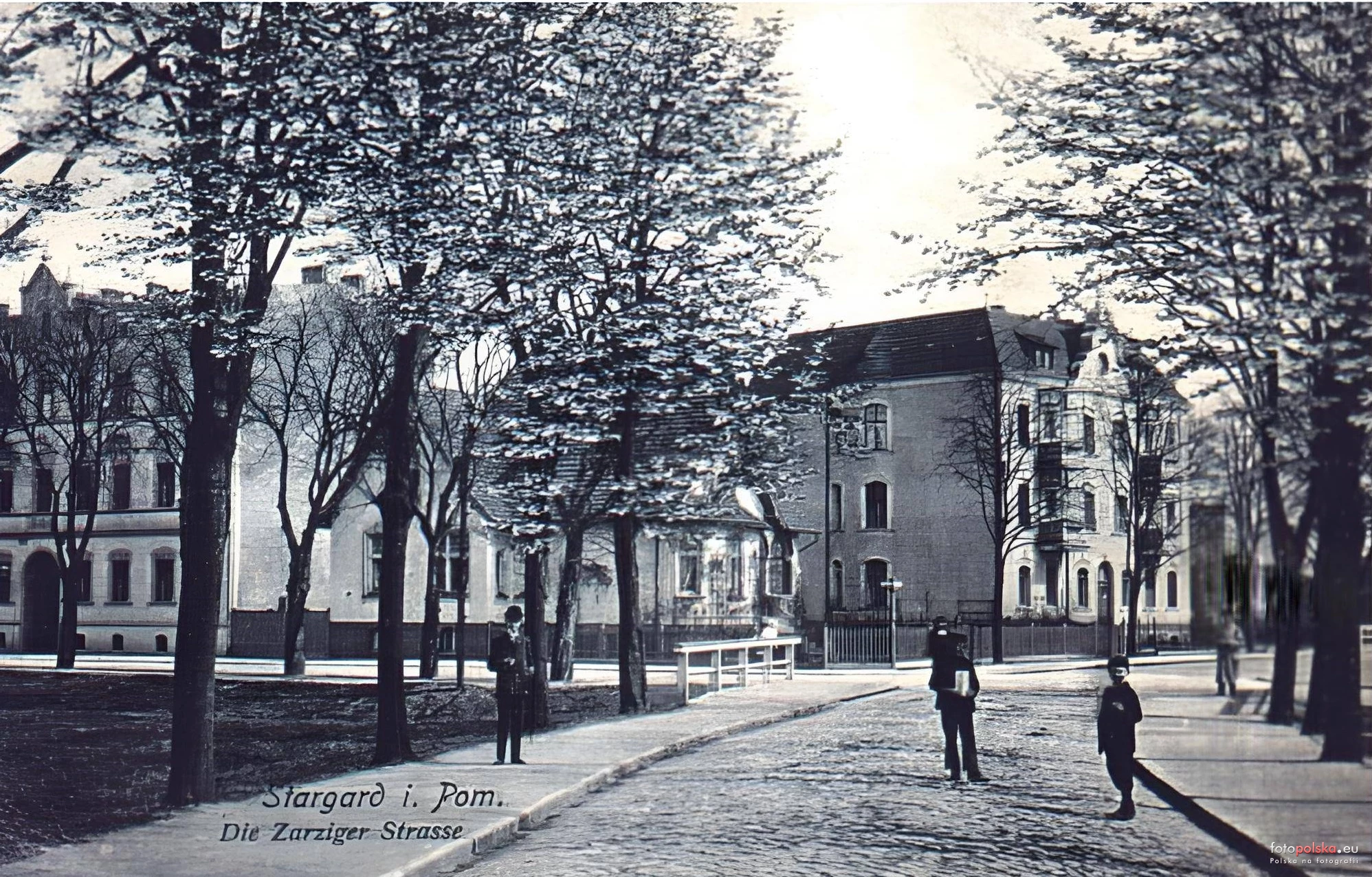 8 pobrań 595 odsłon 6 średnia ocen Poprzednie i następne zdjęcia Wojciech Szuba Obiekty widoczne na zdjęciu ul. Bydgoska więcej zdjęć (235) Dawniej: Zartzigerstrasse [oryg. Zartzigerstrasse (dzisiejsza ulica Bydgoska) początkowo miała charakter drogi wyjazdowej z miasta i określana była jako An der Zartziger Chaussee. Po raz pierwszy taka nazwa została użyta w księdze adresowej z 1874 r., a ulica liczyła wtedy zaledwie 4 numery. Nazwa Zartzigerstr. pojawia się pomiędzy 1889 a 1893 r. Od lat 80. XIX w., aż do około 1911 r. nastąpił czas intensywnej rozbudowy ulicy. W 1885 r. liczba numerów wzrosła do 12, w 1893 r. – 50, a w 1911 r. – 97. W latach 30. XX w. liczba ta wzrosła jeszcze o kilkanaście numerów. Znacząca część parceli była niezabudowana – jeszcze po zakończeniu I wojny światowej było to około 50 numerów. W 1845 r. u wylotu Gr. Mühlenstr. (ul. Kazimierza Wielkiego) w kierunku drogi na Suchań powstała tzw. Neue Thor – Nowa Brama. Umożliwiła ona bezpośrednią komunikację i rozwój urbanistyczny tej części miasta. MaH Stargard (W.S) |