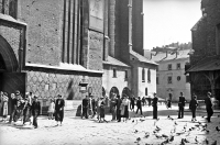 1934 , Plac Mariacki, po lewej fragment Kościoła Mariackiego, po prawej Kościół św. Barbary.Skomentuj zdjęcie