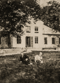 1943 , Ostatni Właściciele Dworu w Kobielach Wielkich - podczas wojny. Jeszcze istniał podjazd okrężny i na wprost od bramy - w murze zewnętrznym. Taki układ zachował się do końca lat 50. Na zdjęciu hr. Jan Sobański i Adam Sobański.Skomentuj zdjęcie