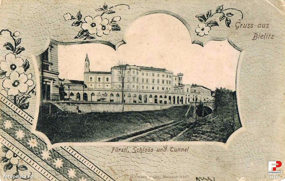 Lata 1900-1915 , Widok na Zamek Sułkowskich z Bazarami Zamkowymi i południowy wlot tunelu kolejowego na pocz. XX wieku.Skomentuj zdjęcie