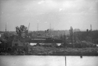 1948 , Wyspa Grodzka widziana z tarasu Wałów Chrobrego, z widocznymi zniszczonymi zabudowaniami klubu wioślarskiego Ruderverein Sport-Germania. Na drugim planie zabudowania Rzeźni miejskiej oraz Nabrzeże Starówka.Skomentuj zdjęcie