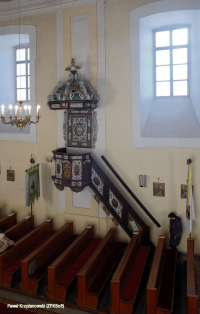 12 grudnia 2021 , Wnętrze kościoła św. Wawrzyńca, który powstał w zaadaptowanym południowym skrzydle pałacu, a dawniej klasztoru, w l. 1706-1711. Kościół jest budowlą jednonawową, krytą sklepieniem kolebkowym z lunetami. Budowla na planie prostokąta z niewyodrębnionym prezbiterium. Na zdjęciu spojrzenie z chóru bocznego na barokową ambonę.Skomentuj zdjęcie |