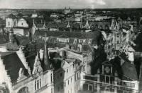 1932 , Fasady kamienic po północnej stronie ul. Wielkiej, z lewej dawny kościół Dominikanów (obecnie kościół Jezuitów), w głębi katedra, około 1932 roku.