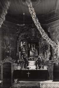 1950 , Ołtarz główny w prezbiterium.Skomentuj zdjęcie |