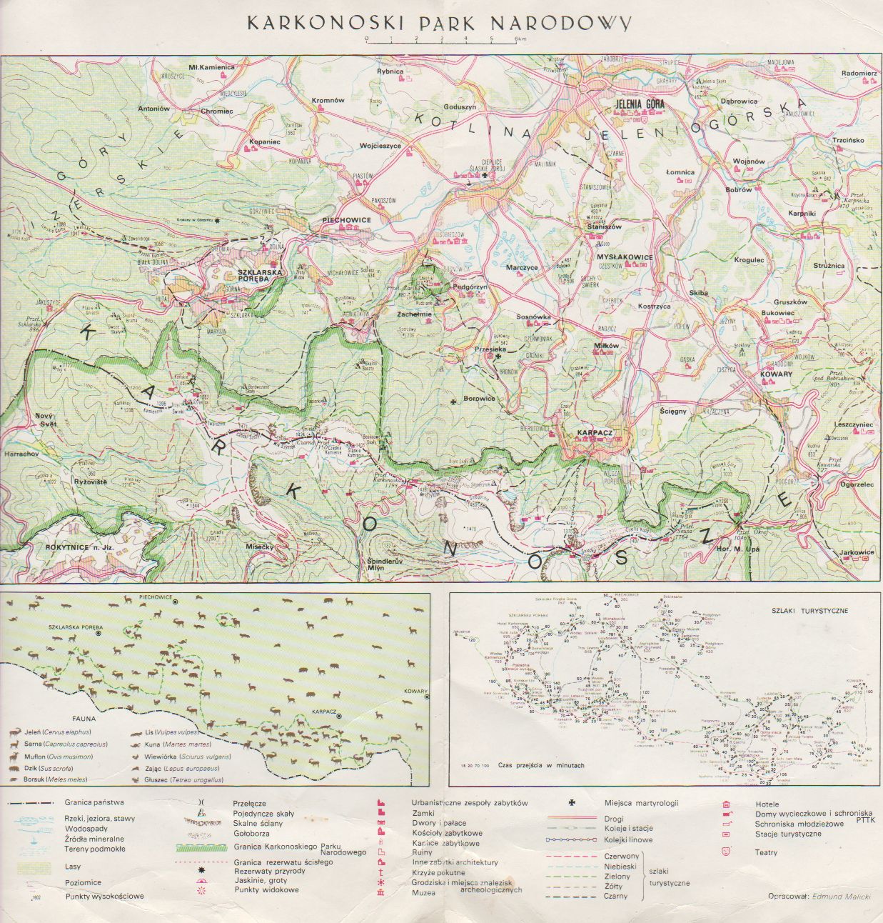 1 pobranie 269 odsłon 6 średnia ocen Poprzednie i następne zdjęcia Dürgoy Marcin Obiekty widoczne na zdjęciu Mapy i plany (Karkonosze) więcej zdjęć (34) Karkonosze więcej zdjęć (203) Dawniej: Riesengebirge Karkonosze (łac. Askiburgion; pol. n. tradyc. do 1946 Góry Olbrzymie, również Karkonosze, czes. Krkonoše, czes. gwar. góral. Kerkonoše, śl. Gůry Uolbrzimje, śl.-niem. Riesageberge, niem. Riesengebirge, ang. Giant Mountains) – najwyższe pasmo górskie Sudetów i zarazem Czech rozciągające się na przestrzeni ok. 40 km (od Przełęczy Szklarskiej na zachodzie do Przełęczy Lubawskiej na wschodzie). Szerokość pasma waha się od 8 do 20 km. Karkonosze zajmują powierzchnię ok. 650 km², z czego do Polski należy 185 km² czyli 28,46%. Głównym grzbietem oraz Grzbietem Lasockim przebiega granica polsko-czeska. Najwyższym szczytem jest Śnieżka (1603 m n.p.m.) – najwyższy szczyt Czech, Sudetów i Śląska. Karkonosze należą do Światowej Sieci Rezerwatów Biosfery UNESCO i są chronione poprzez utworzenie na ich terenie Karkonoskiego Parku Narodowego oraz Krkonošského národní parku. Karkonosze położone są w Sudetach Zachodnich, stanowiąc ich centralną część. Od północy graniczą z Kotliną Jeleniogórską, od północnego wschodu poprzez Przeł. Kowarską z Rudawami Janowickimi, od wschodu ze wzgórzami Bramy Lubawskiej (Kotliną Kamiennogórską), od południowego wschodu poprzez Przełęcz Lubawską z Górami Kruczymi, od południa z Podgórzem Karkonoskim i od zachodu poprzez Przeł. Szklarską z Górami Izerskimi. W rzeźbie Karkonoszy wyróżnia się dwa grzbiety o przebiegu wschód-zachód oraz grzbiety południowe, tzw. „Rozsochy”. W północnej części leży Pogórze Karkonoskie oddzielone od Grzbietu Śląskiego Karkonoskim Padołem Śródgórskim. Główny Grzbiet Karkonoszy Główny Grzbiet Karkonoszy rozciąga się od Przełęczy Szklarskiej do Przełęczy Okraj; dzieli się na Grzbiet Śląski, Grzbiet Czarny i Grzbiet Kowarski. Biegnie nim granica polsko-czeska. Czeski Grzbiet Na południe od niego rozciąga się równoległy, nieco krótszy Czeski Grzbiet, przecięty w połowie długości przełomową doliną Łaby. Grzbiety południowe Poprzecznie do Głównego i Czeskiego Grzbietu biegną grzbiety południowe, zwane po czesku Krkonošské rozsochy. Są to, od zachodu: Vilémovská hornatina, Vlčí hřbet, Žalský hřbet i Černohorská hornatina, odchodzące na południe od Czeskiego Grzbietu. Od Śnieżki (Czarny Grzbiet) odchodzi grzbiet zwany Růžohorská hornatina, oddzielony od Czeskiego Grzbietu i Černohorske hornatiny doliną Úpy. Od Kowarskiego Grzbietu w kierunku południowym odchodzi Lasocki Grzbiet, którym również biegnie granica polsko-czeska oraz leżące na jego przedłużeniu ku południowi Rýchory. Wszystkie grzbiety o południkowym przebiegu, poza granicznym Lasockim, leżą całkowicie w Czechach. Karkonoski Padół Śródgórski Na północ od Śląskiego Grzbietu znajduje się Karkonoski Padół Śródgórski – głębokie obniżenie oddzielające go od Pogórza Karkonoskiego. Pogórze Karkonoskie Pogórze Karkonoskie leży pomiędzy Karkonoskim Padołem Śródgórskim na południu i Kotliną Jeleniogórską na północy. Składa się z wielu masywów poprzecinanych przełomowymi dolinami potoków. Skałki Charakterystycznym elementem karkonoskiego krajobrazu są malownicze formy skalne, zwane tu skałkami. Łącznie można wyróżnić co najmniej 150 grup skalnych i pojedynczych skałek, różnej wielkości, kształtu i wysokości sięgającej do 25 m (np. Pielgrzymy). Z racji fantastycznych kształtów i związanych z nimi legend, skałki przybrały osobliwe nazwy: Owcze Skały, Ptasie Gniazda, Końskie Łby, Twarożnik, Kukułcze Skały, Borówczane Skały, Paciorki, Bażynowe Skały, Słonecznik, Kotki, Szwedzkie Skały i in. Kotły polodowcowe Ochłodzenie w plejstocenie z jednoczesnym obniżeniem granicy wiecznego śniegu do wysokości 1000–1200 m n.p.m. spowodowały powstanie w Karkonoszach lokalnego zlodowacenia górskiego. W jego następstwie na północnym stoku Karkonoszy powstało 6 kotłów lodowcowych. Poczynając od zachodu są to: 2 bliźniacze Śnieżne Kotły (Mały i Wielki), Czarny Kocioł Jagniątkowski, Kocioł Wielkiego Stawu, Kocioł Małego Stawu i Kocioł Łomniczki. Po południowej stronie występują: Labský důl, Kotelní jámy, Úpská Jáma, Studniční jámy, Modrý důl i Zelený důl. Nisze niwalne Ponadto, na północnym stoku Karkonoszy, występują nisze niwalne (ich rozwój w plejstocenie determinowały płaty firnu i śniegu). Największymi, co do rozmiarów, są nisze pod Szrenicki Kocioł, Łabski Kocioł, kocioł pod Śmielcem, kocioł pod Tępym Szczytem, Kocioł Smogorni i nisza Biały Jar. Źródło: |