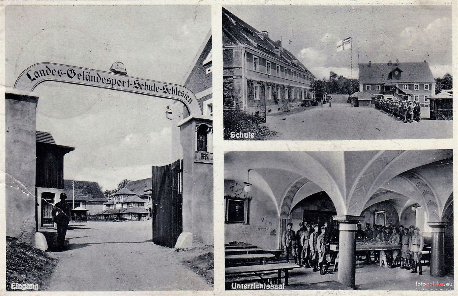 1933 , Teren dawnego folwarku Lehngut, po I wojnie światowej wojskowa Okręgowa Szkoła Sportowa w Hohndorf (Landes-Geländesportschule des Stahlhelm), ok. 1938 roku przejęta przez organizację Hitlerjugend. Obecnie gospodarstwo z numerem 29 w Górczycy. Na widokówce brama wjazdowa, na wprost z zegarem budynek administracyjny, po jego lewej stronie budynek szkolno - koszarowy.Skomentuj zdjęcie |