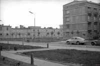 1963 , Wylot ul. Karmelickiej w kierunku ul. Anielewicza. Z prawej blok mieszkalny przy ul. Anielewicza 11 i zaparkowany samochód Warszawa oraz IFA F8. W tle budynek dawnych Koszar Wołyńskich (Koszar Artylerii Koronnej) przy ul. AnielewiczaSkomentuj zdjęcie