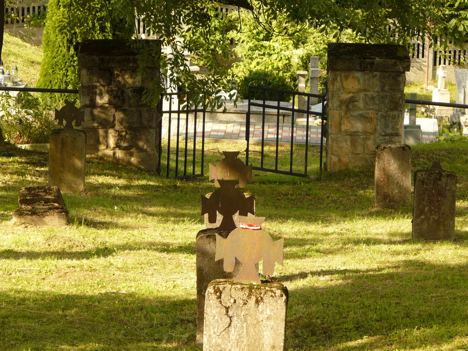 Cmentarz wojenny nr 135 więcej zdjęć (8) Architekt: Anton Müller Atrakcja turystyczna Zbudowano: 1916-1918 Cmentarz wojenny nr 135 w Zborowicach, zaprojektowany przez Antona Müllera. Założony na planie prostokąta na terenie jako kwatera na cmentarzu parafialnym. Ogrodzony słupami z kamienia łupanego, pomiędzy którymi rozpięto metalową rurę (pierwotnie wg zdjęcia archiwalnego były dwie rury). Wejście poprzez dwuskrzydłową metalową furtkę. Elementem centralnym jest wysoki kamienny krzyż. Wzdłuż ogrodzenia wiekowe drzewa. Pochowano tutaj 23 żołnierzy austro-węgierskich, 49 niemieckich oraz 2 rosyjskich w 22 grobach pojedynczych i 6 zbiorowych. |