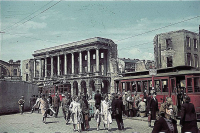 Widoczny jest mur getta warszawskiego i Hala Gwardii po lewej stronie. Ludzie na zdjęciu są poza gettem. Można dopisać fot. do tych miejsc. Fot. Agfacolor.