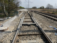 1 maja 2022 , Przystanek (nowy) Kosmonautów Szpital i mijanka na nowej trasie tramwajów do Leśnicy. Stary przystanek Kosmonautów Szpital widoczny w tle po lewej stronie. Widok ma wschód przed budowanym skrzyżowaniem Kosmonautów-Fieldorfa-11 Listopada.Skomentuj zdjęcie