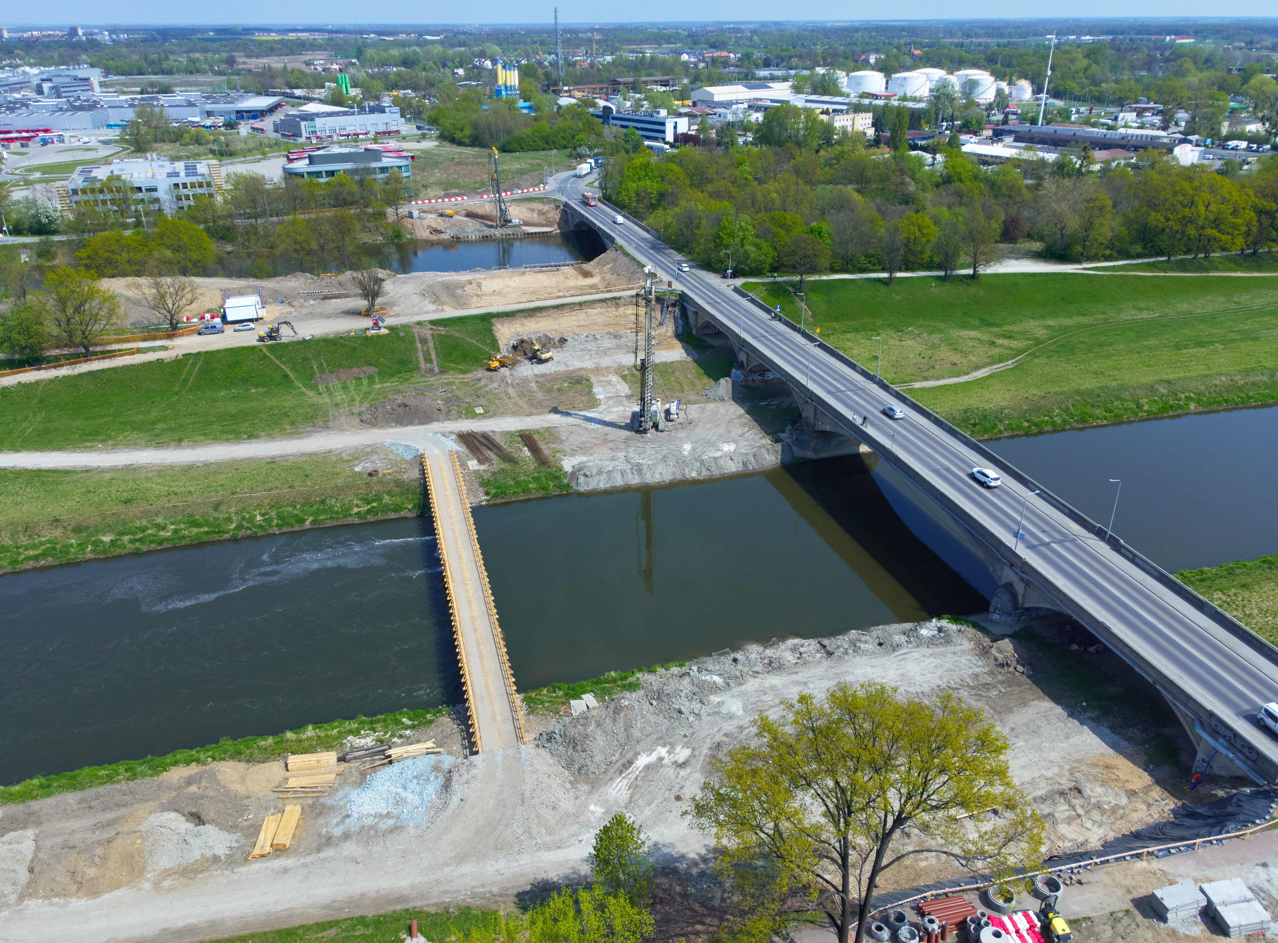 2 maja 2022 , Budowa nowych mostów (na których powstanie torowisko tramwajowe). Na placu budowy widoczna tymczasowa przeprawa przez Kanał Powodziowy.Skomentuj zdjęcie |