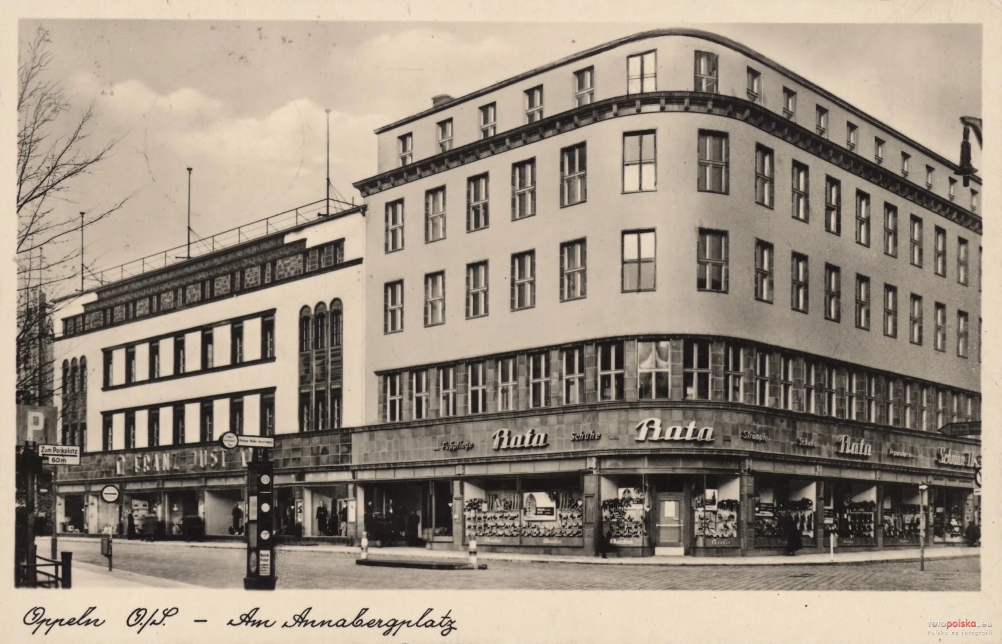 Lata 1935-1938 , Dom towarowy Franza Justa i sklep obuwniczy znanej czeskiej firmy Bata. Po wojnie budynek domu towarowego odbudowano z gruzów tak, by nawiązywał wizualnie do sąsiada, tworząc w ten sposób dzisiejszy biurowiec Europa.Skomentuj zdjęcie