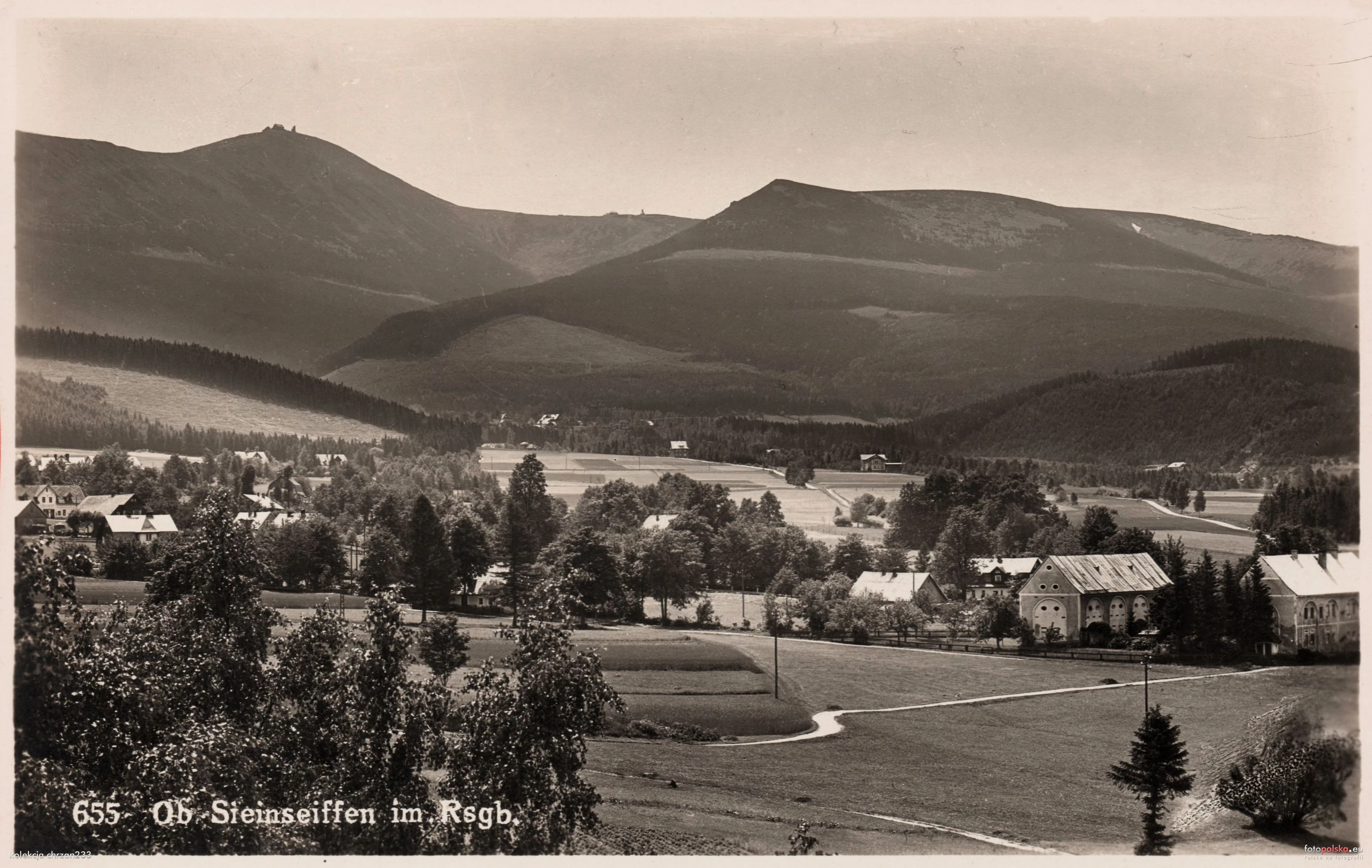 Lata 1925-1929 , Panorama dawnych Górnych Ściegien (a dzisiejszego Karpacza), ze Śnieżką i Kopą w tle. |
