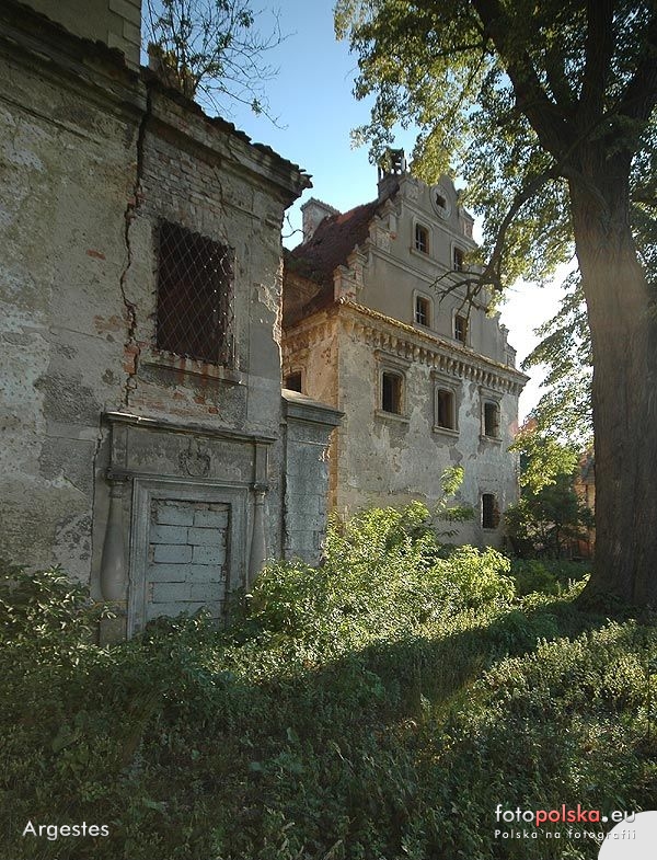 2 pobrania 773 odsłony 6 średnia ocen Poprzednie i następne zdjęcia Argestes Obiekty widoczne na zdjęciu Pałac więcej zdjęć (52) Zbudowano: 1558 Zamek wzniesiono około 1558 roku a nastepnie gruntownie przebudowano w 1700 roku. Posiada on założenie dwuskrzydłowe i dwukondygnacjowe; we wnetrzach zachowały się sale z wyposażeniem z XVII i XVIII wieku. bonczek/hydroforgroup/2005 - "Zabytki Dolnego Ślaska" 1962 DZIEWIN-ZAMEK/PAŁAC - Wybudowany w XIII w. książęcy zamek, odsprzedano w 1287 r. rycerzowi Ottonowi von Zedlitz, przedstawicielowi rodu posiadającego rozległe dobra. Znani później jako ród Siedliczów, posiadali m.in. zamki Cisy, Grodziec czy Nowy Dwór. Pod ich władaniem Dziewin pozostał, aż do 1508 r. kiedy to zamek kupili Kanitzowie. Trzech braci w 1558 r. rozpoczęło budowę renesansowego pałacu, i w takiej postaci budowla dotrwała do naszych czasów. W XVIII wieku dodano budowli barokowe dekoracje, ale po roku 1804 był już tylko częściowo zamieszkany. Aktualnie w ruinie, ale z dość dobrze zachowanymi elementami renesansowej i barokowej architektury (mietok) Przez wiele lat wieś była własnością książęcą. Książęcy zamek istniał tu już w XIII w. W 1287 r. książę Henryk III głogowski sprzedał część wsi, prawdopodobnie bez zamku, Ottonowi von Zedlitz. W połowie XV w. część wsi, bez zamku, należała do rodziny von Kanitz, a zamek nadal był własnością książęcą. W 1508 r. dobra nabyli, wciąż w części, od książąt Albrechta i Karla z Podiebradów, bracia Friedrich i Siegmund von Kanitz. Dopiero potomkowie Friedricha, bracia Lassel, Wolf i Siegmund przejęli dobra dziewińskie w całości. Oni właśnie w latach 1558 - 1566, na miejscu zamku, zbudowali renesansowy dwór. Ok. 1580 r. dobudowano drugą część skrzydła wschodniego i w ten sposób zamknięto dziedziniec. Jeden z kolejnych właścicieli, Hans Friedrich von Mütschelnitz dobudował w roku 1700 skrzydło barokowe. Od rodziny von Mütschelnitz majątek nabyła w roku 1721 rodzina von Schweinitz und Krain. Obiekt był restaurowany w latach 1860 - 1889. Ujednolicono wówczas wygląd przybudówek i zlikwidowano wykusze latrynowe. Ostatnim właścicielem, do 1945 r, był Erich hrabia von Schweinitz und Krain baron von Kauder. Obecnie znajduje się w zasobach AWRSP (thor za R.M. Łuczyńskim) |
