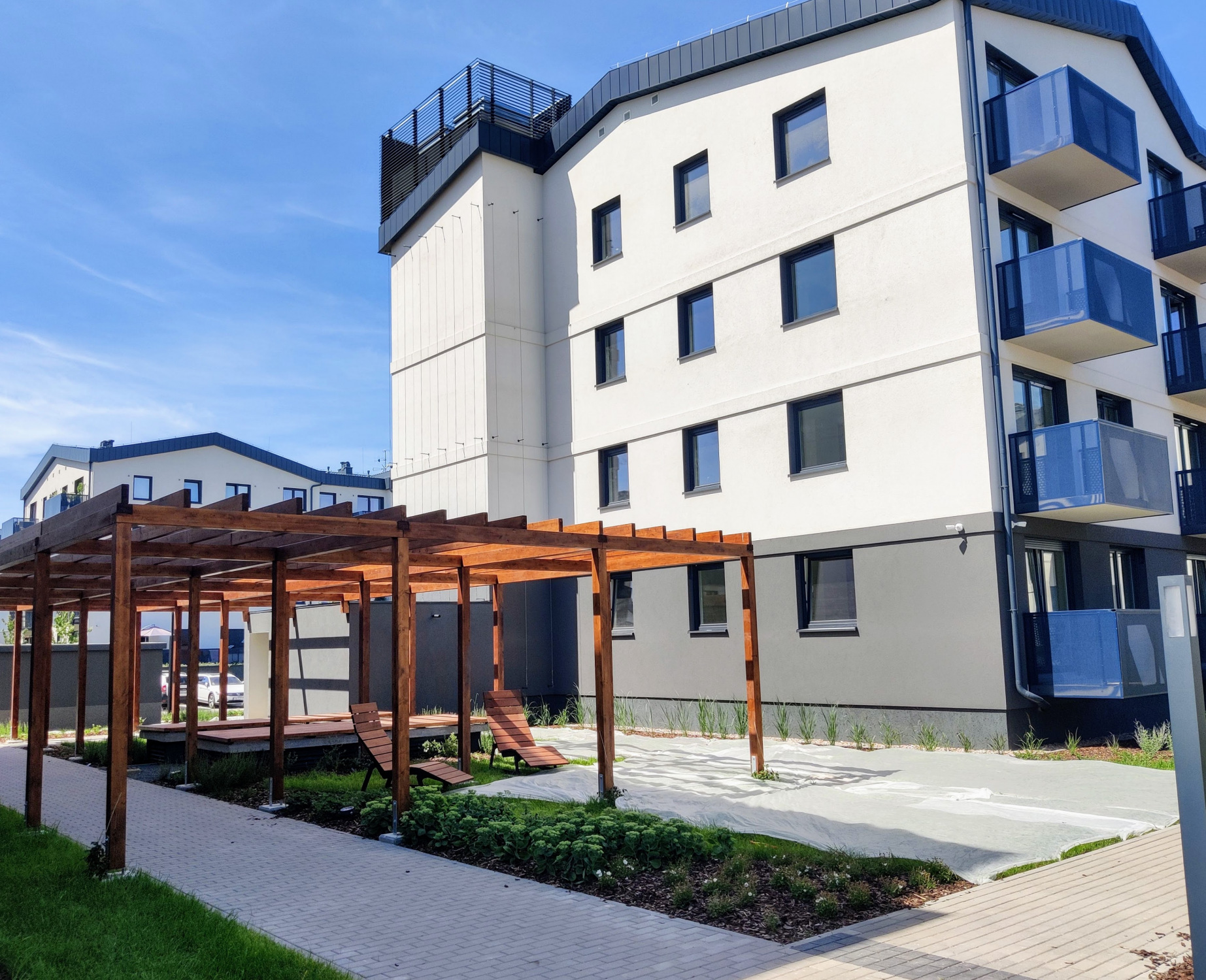 18 lipca 2022 , Zespół budynków po parzystej stronie ul. Chachaja. Na pierwszym planie rekreacyjny trejaż dla mieszkańców, widoczny zaraz za nim budynek ma adres Chachaja 16. Szary niewielki obiekt za trejażem to osiedlowa trafostacja, a na trzecim planie wybudowany wcześniej (bodaj w 2020) budynek przy Chachaja 4.Skomentuj zdjęcie |