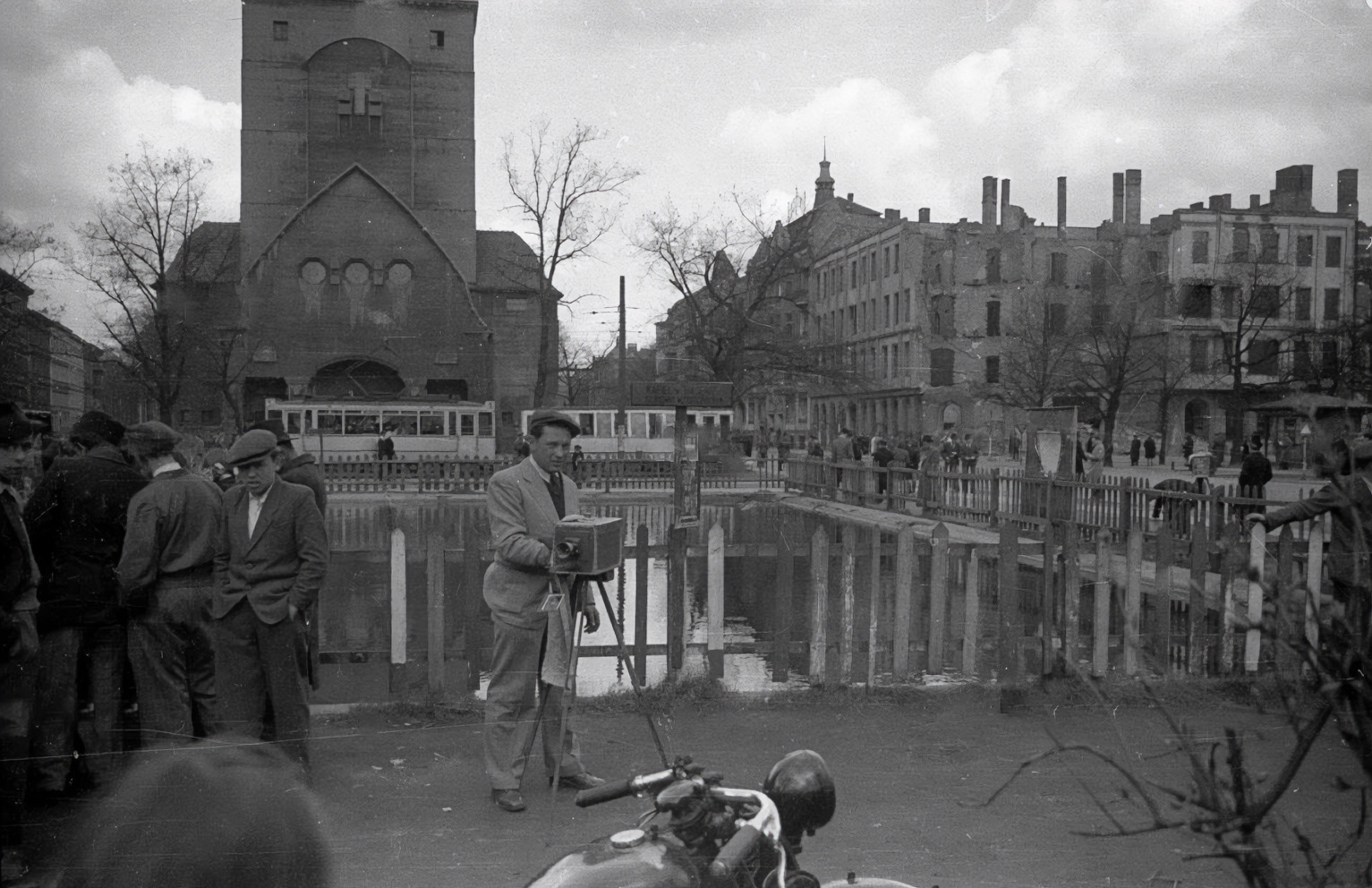 kwiecień 1948 , W iluż to domach są pamiątkowe zdjęcia z białym misiem czy na motocyklu. Zawsze po drugiej stronie aparatu, tutaj uliczny fotograf widoczny przy pracy. Z prawej strony zdjęcia ruina kamienicy Hohenzollernplatz 2Skomentuj zdjęcie