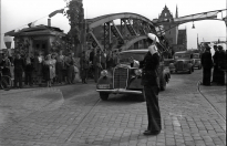 wrzesień 1947 , Milicjant kierujący ruchem przy zejdzie z Mostu Hanzy ówcześnie nazywanym Mostem Sobieskiego. W miejscu wysadzonego przęsła zwodzonego wybudowano drewnianą kładkę co umożliwiało poruszanie się po moście, jak widać na zdjęciu kładka utrzymywała nawet przejazd samochodów. W takiej formie most funkcjonował do początku lat '50. Zdjęcie wykonano w bliskim czasie od uroczystości przekazania portu z 27 września.Skomentuj zdjęcie