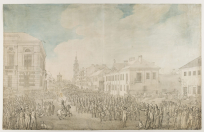 Lata 1850-1860 , Przemarsz wojsk Księstwa Warszawskiego przez Krakowskie Przedmieście. Obraz namalowany przez Wilhelma Stanisława Beyera z architekturą skopiowaną z Zygmunta Vogla (wg BN) lub Aleksandra Orłowskiego ( .Skomentuj zdjęcie |