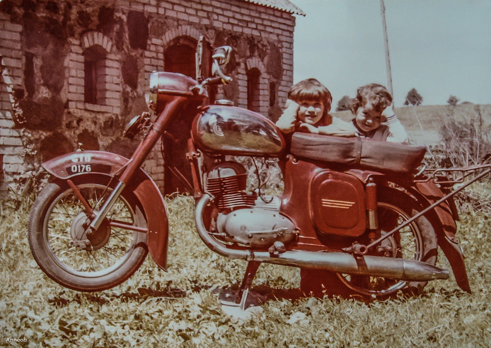 1986 , Budy Sułkowskie nr 18. Po lewej, jedno z zachowanych (dawnych) zabudowań gospodarczych. W centrum, Jawa CZ 175.Skomentuj zdjęcie