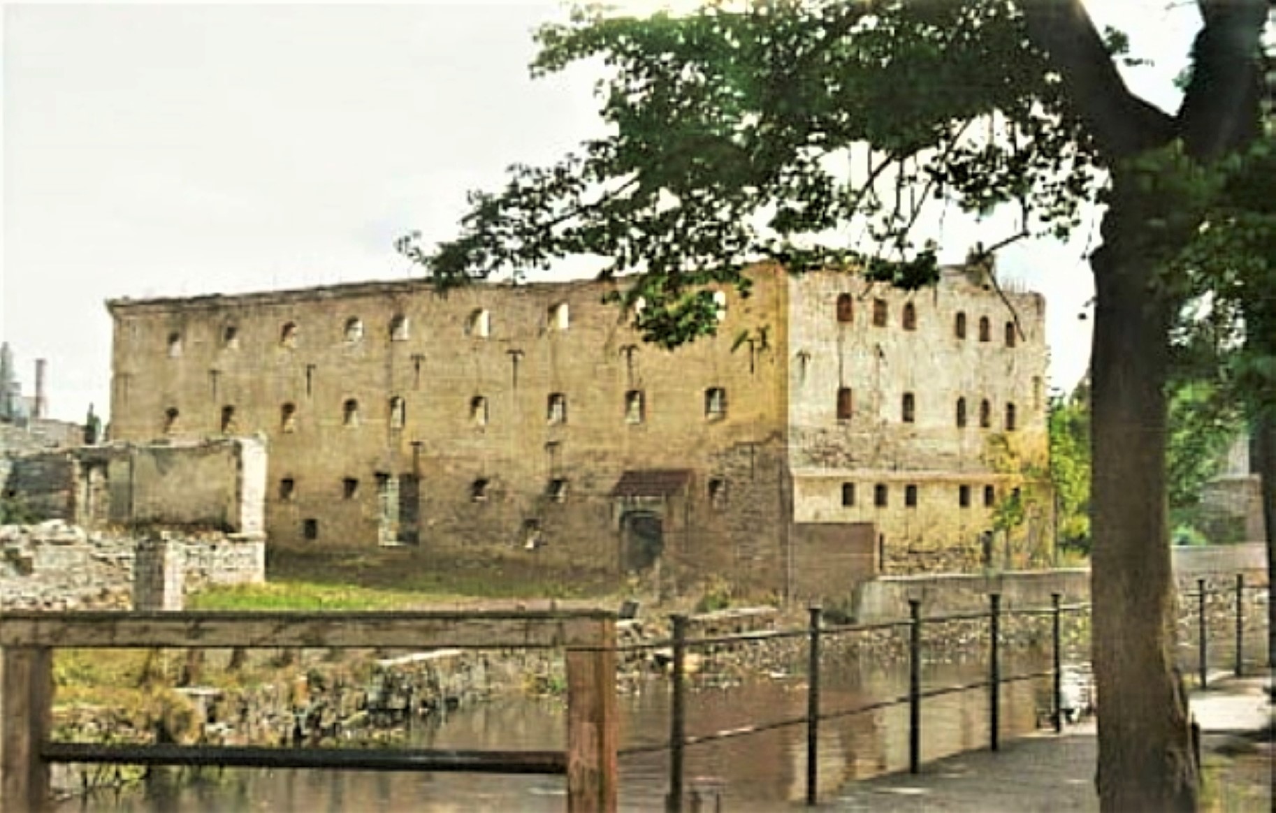 1949 , Stargard - 1949 r. Spichlerz widok zza Kanału Młyńskiego , przy Bramie Młyńskiej , widoczna po lewej drewniana poręcz mostku .Skomentuj zdjęcie