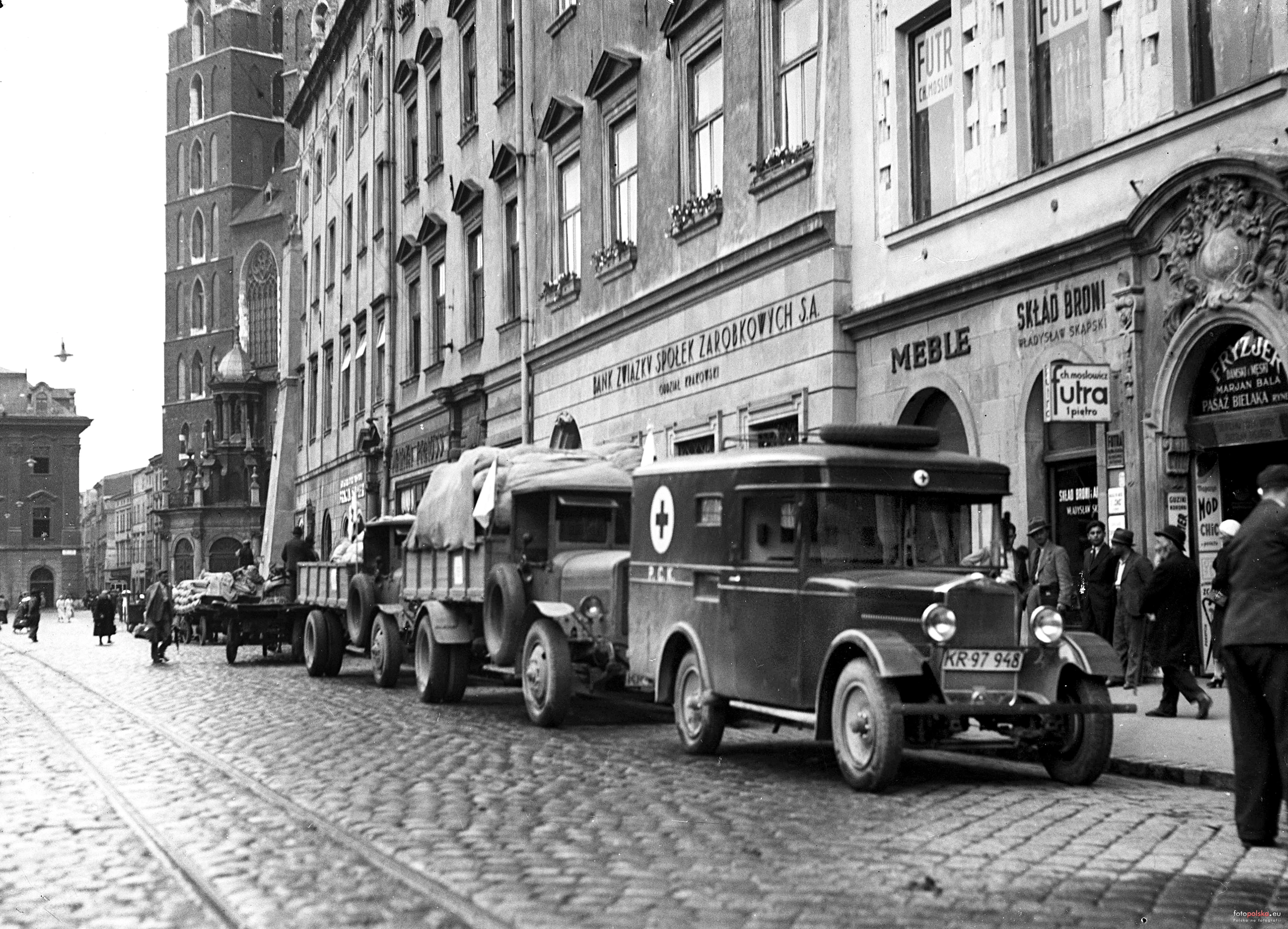 lipiec 1934 , Kolumna sanitarna krakowskiego oddziału PCK przy Linii G-H, widoczne kamienice: Szara, Montelupich, Pod Jaszczurką i Bonerowska.Skomentuj zdjęcie |