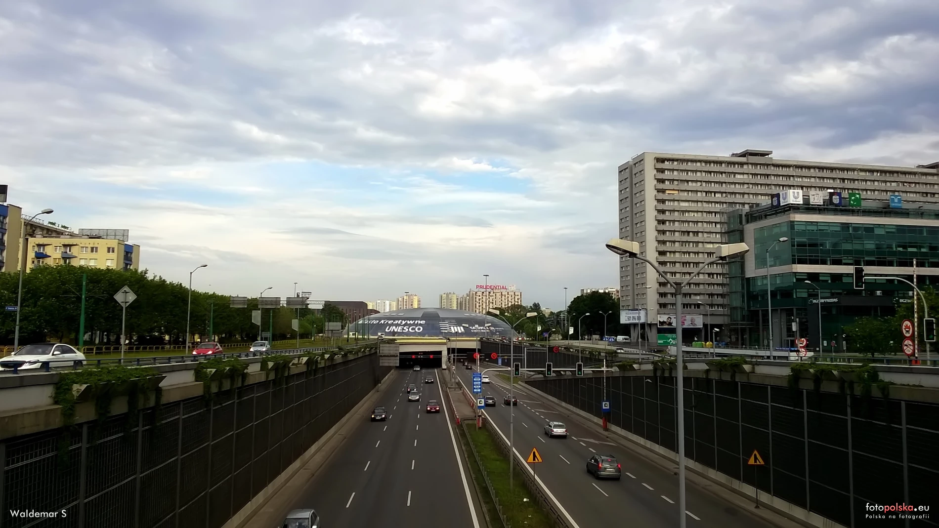 28 maja 2016 , Katowice - Śródmieście, Koszutka, Osiedle Tysiąclecia, Dąb, Ulica Chorzowska. Widok z wiaduktu na ul. Sokolskiej na fragment ulicy Chorzowskiej w kierunku "Spodka". Dokładnie 23 maja 2005 zburzono stary wiadukt w ciągu ul. Sokolskiej w Katowicach. Nowy wiadukt liczy 30,9 m długości i 28,6 m szerokości. Do dyspozycji zmotoryzowanych jest sześć pasów ruchu, po trzy w każdym kierunku. – Wiadukt ma tzw. klasę A, czyli nośność 50 ton.Skomentuj zdjęcie |
