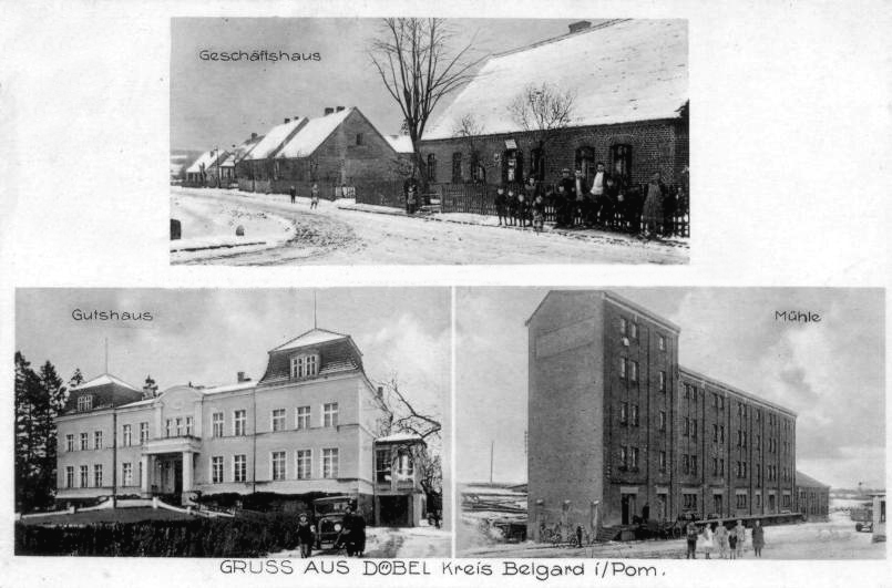 Lata 1925-1935 , Doble na pocztówce: u góry budynek z lokalnym sklepem, na dole pałac w majątku ziemskim oraz młyn.Skomentuj zdjęcie |