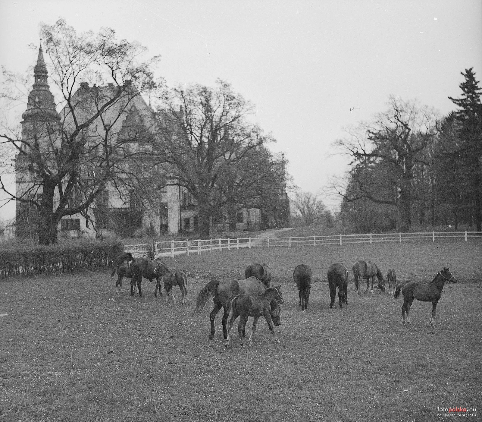 1950 , Stadnina koni w Mosznej, w głębi zamek.Skomentuj zdjęcie |