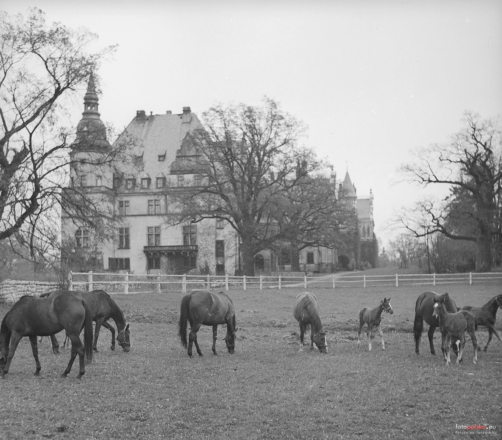 1950 , Stadnina koni w Mosznej, w głębi zamek.Skomentuj zdjęcie |