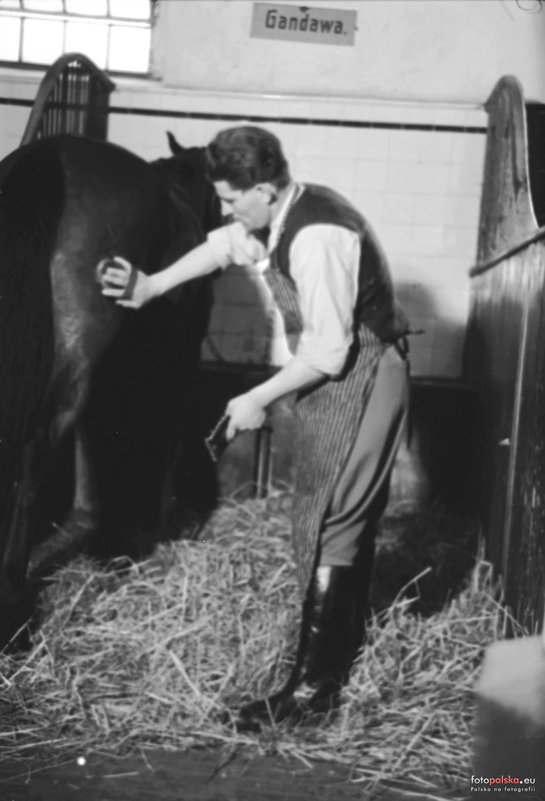 1950 , Stadnina koni w Mosznej, oporządzanie klaczy o imieniu Gandawa.Skomentuj zdjęcie |