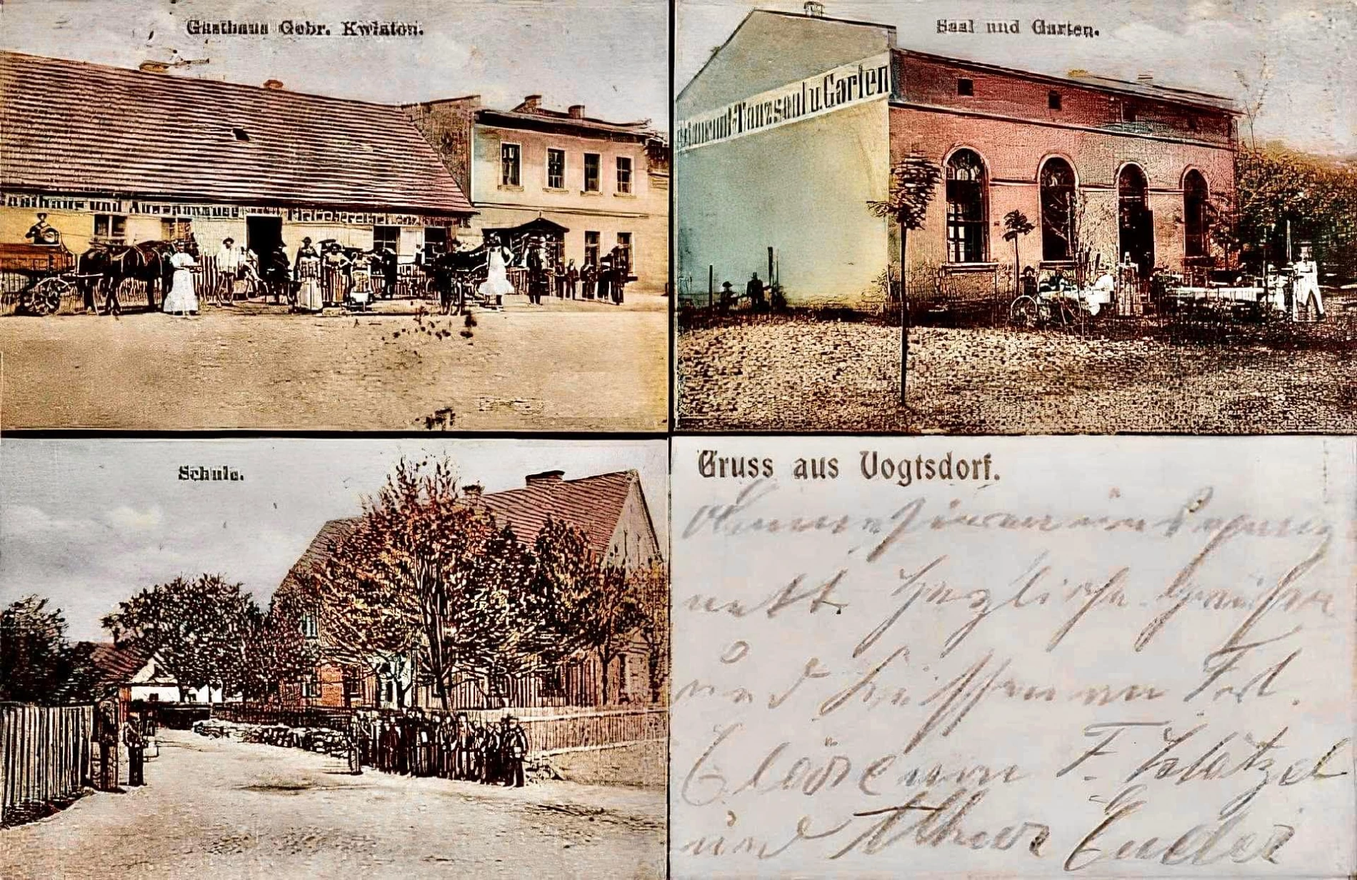 Lata 1900-1920 , Centrum Wójtowej Wsi ok 1900 roku. W miejscu obecnego sklepu znajdowała się sala taneczna i gospoda Pod Czarnym Orłem (wcześniej pod... Białym - Niemcy kilka lat przed 1 światową zmusili właściciela do zmiany nazwy, a ten sympatyzował z Polakami, których na wsi było więcej niż w mieście). W 1992 budynek został przebudowany na potrzeby sklepu spożywczego i takowy funkcjonuje w nim do dziś. Szkoła i tzw "dom nauczyciela" też niewiele się zmienił. Rozpoczynałem w nim edukację w 1991. Dom obok szkoły nadal istnieje.Skomentuj zdjęcie |