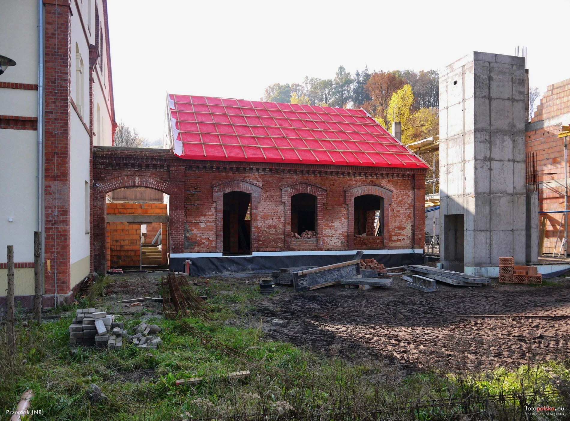 27 października 2022 , Budowa hali sportowej przy Szkole Podstawowej w Ludwikowicach Kłodzkich, na zdjęciu remont łącznika między szkołą a halą. |