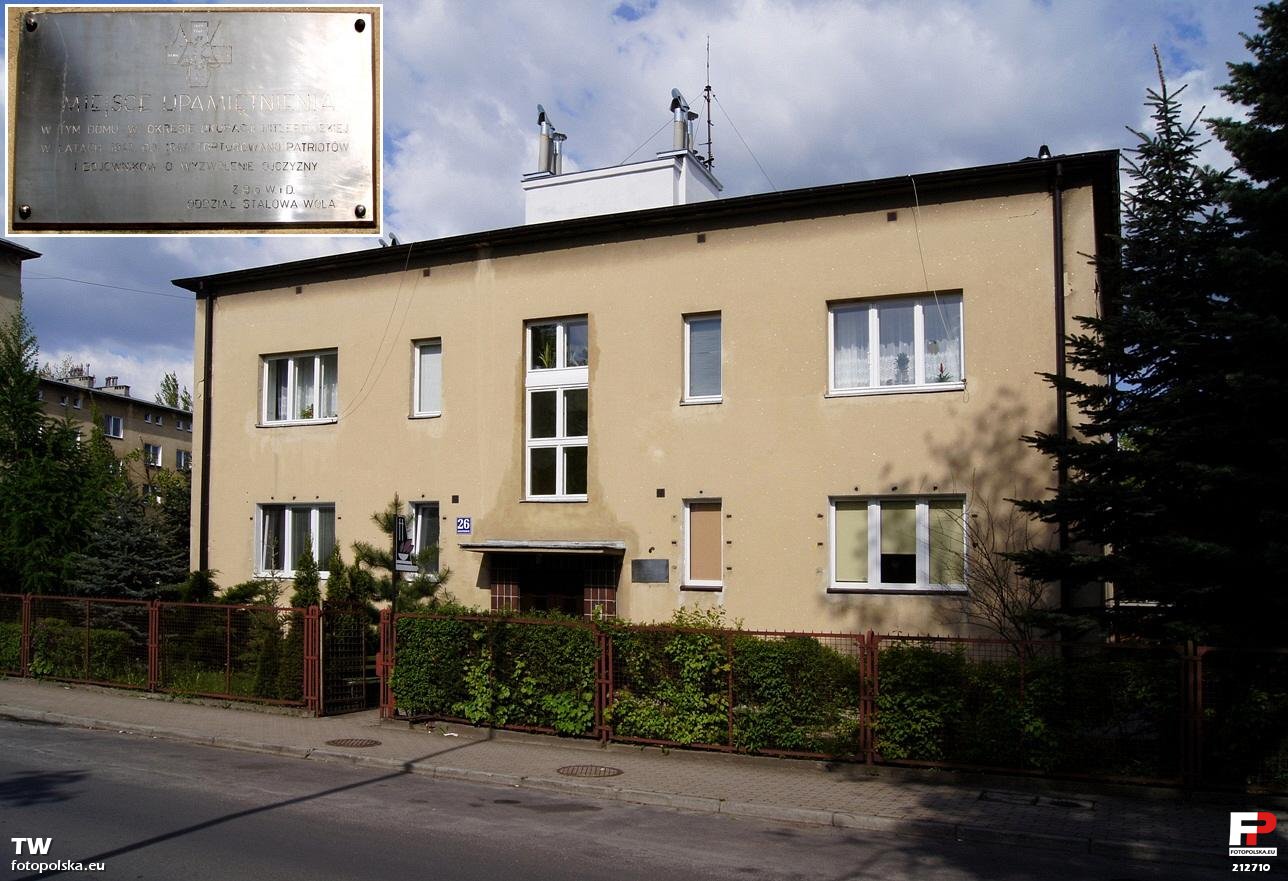 8 maja 2011 , Miejsce Pamięci Narodowej - budynek nr 26 przy ul. ks. Józefa Skoczyńskiego w Stalowej Woli. Na budynku tablica pamiątkowa z napisem: "MIEJSCE UPAMIĘTNIENIA W tym domu w okresie okupacji hitlerowskiej w latach 1942 do 1944 torturowano patriotów i bojowników o wyzwolenie Ojczyzny Z.B.o W.i D. Oddział Stalowa Wola".Skomentuj zdjęcie |