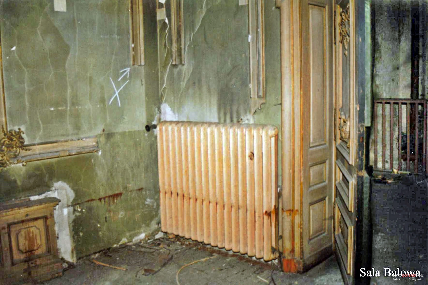 1997 , Fragment sali balowej. Wieloletni remont opuszczonego budynku rozpoczął się w 1998r. W pierwszym etapie prac przystąpiono do kompleksowej naprawy mansardowego dachu, którego katastrofalny stan od końca lat 80. XX w., dramatycznie się pogarszał, powodując liczne ubytki pokrycia i konstrukcji. |