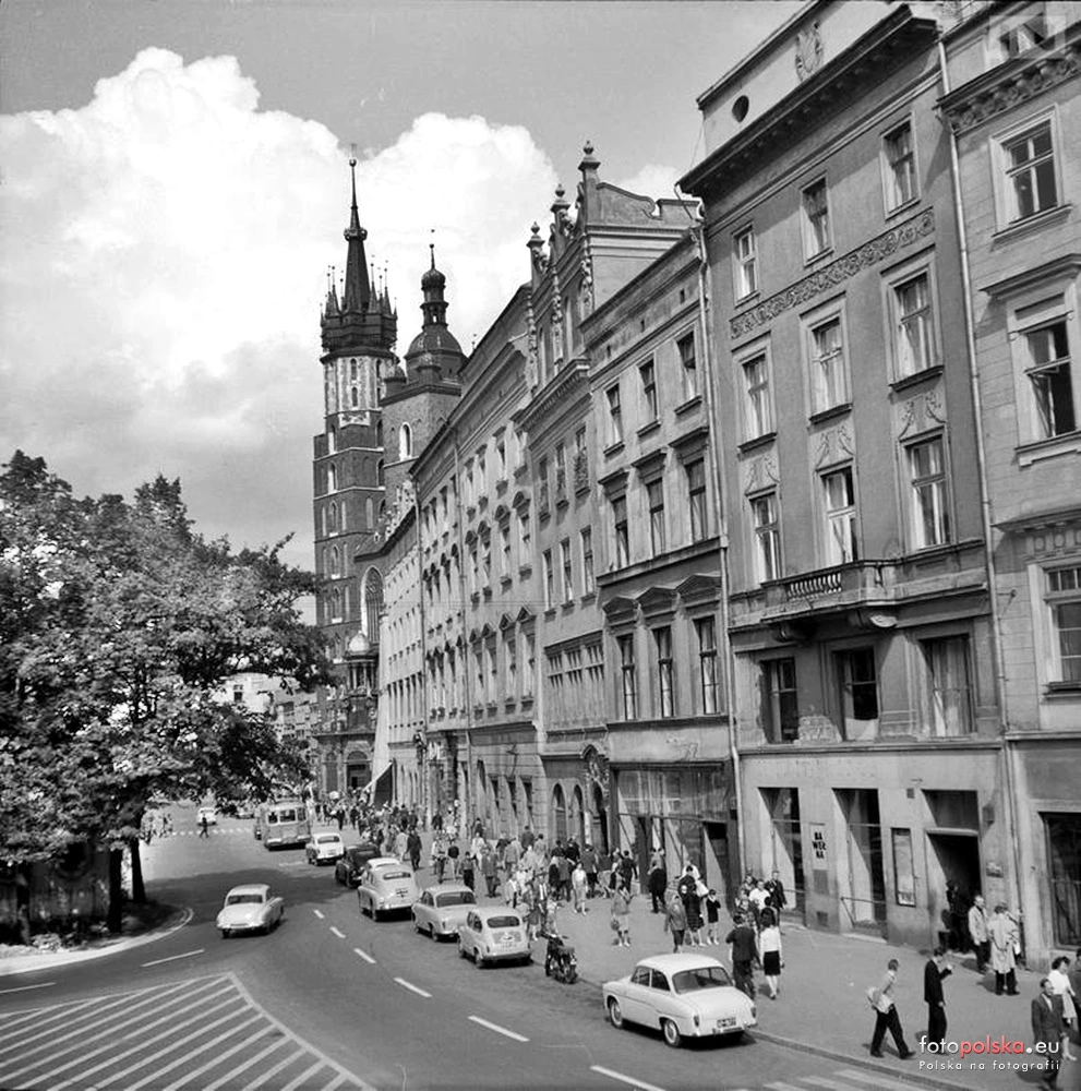 Lata 1965-1970 , Rynek Główny, Linia G-H, widoczne kamienice 11-7 i Kościół Mariacki.Skomentuj zdjęcie