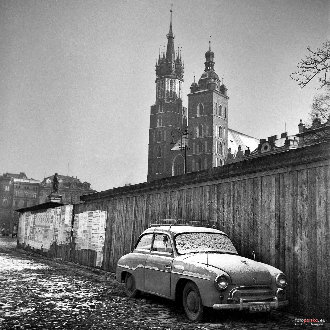1961 , Fragment Rynku Głównego z widocznym ogrodzeniem w związku z pracami remontowymi, centralnie Syrena 101.Skomentuj zdjęcie |