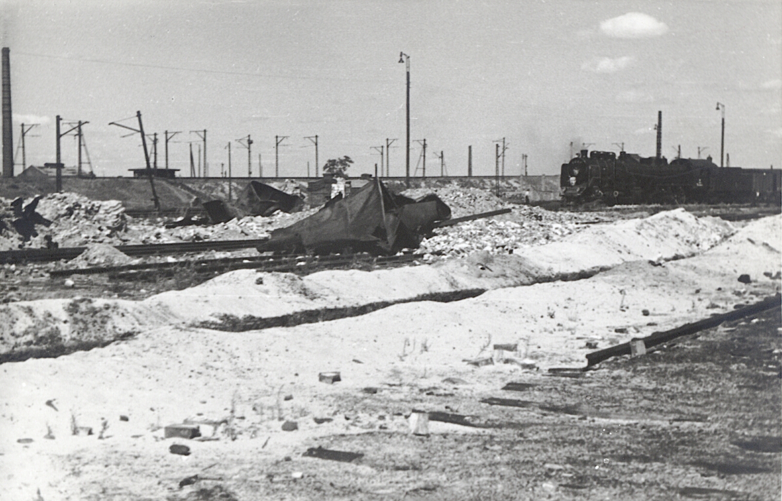 10 sierpnia 1945 , Szczątki sąsiadującej z lokomotywownią wieży ciśnień.Skomentuj zdjęcie |