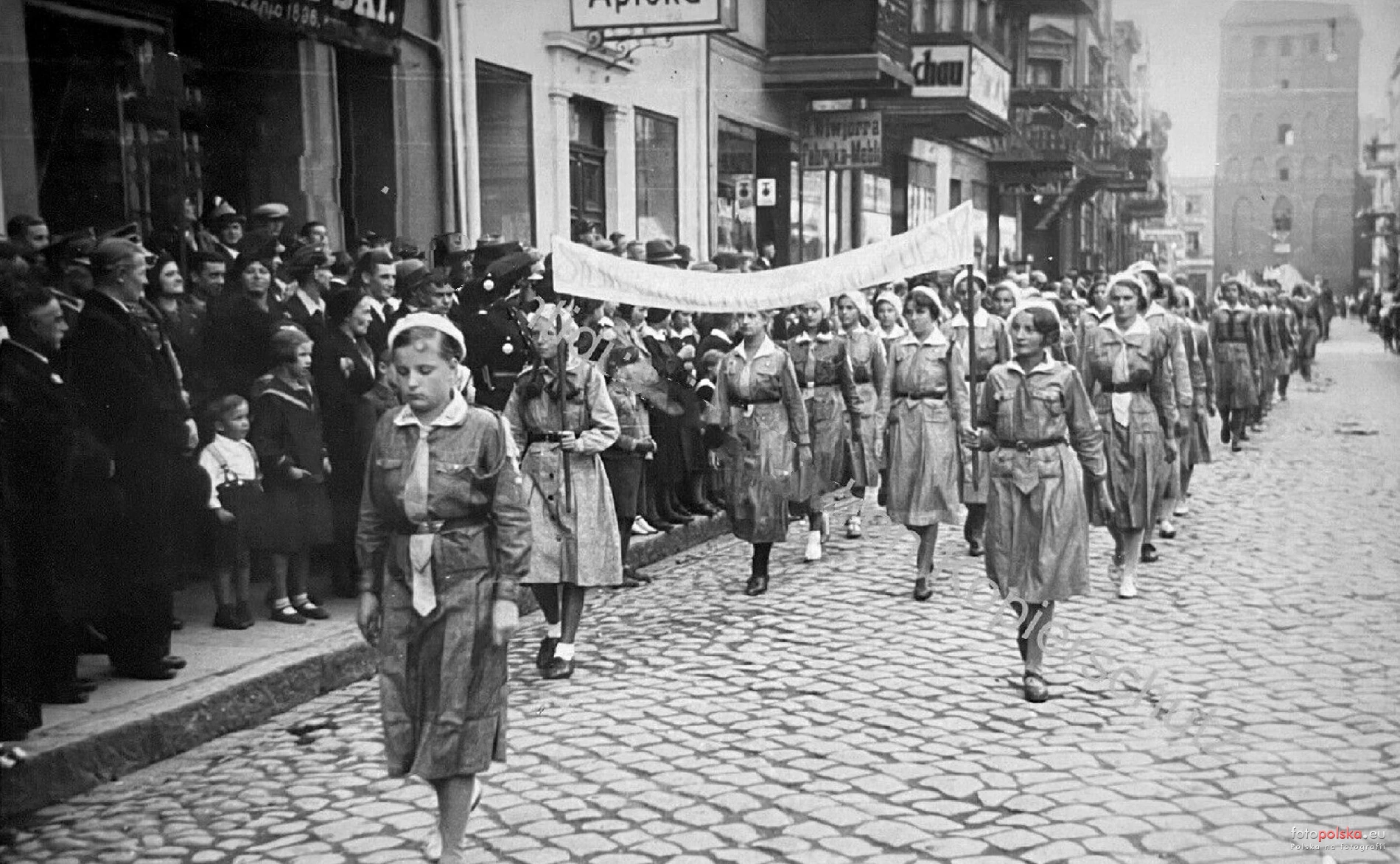 Przemarsz harcerek w pochodzie w ramach 14.Tygodnia Ligi Obrony Powietrznej i Przeciwgazowej.