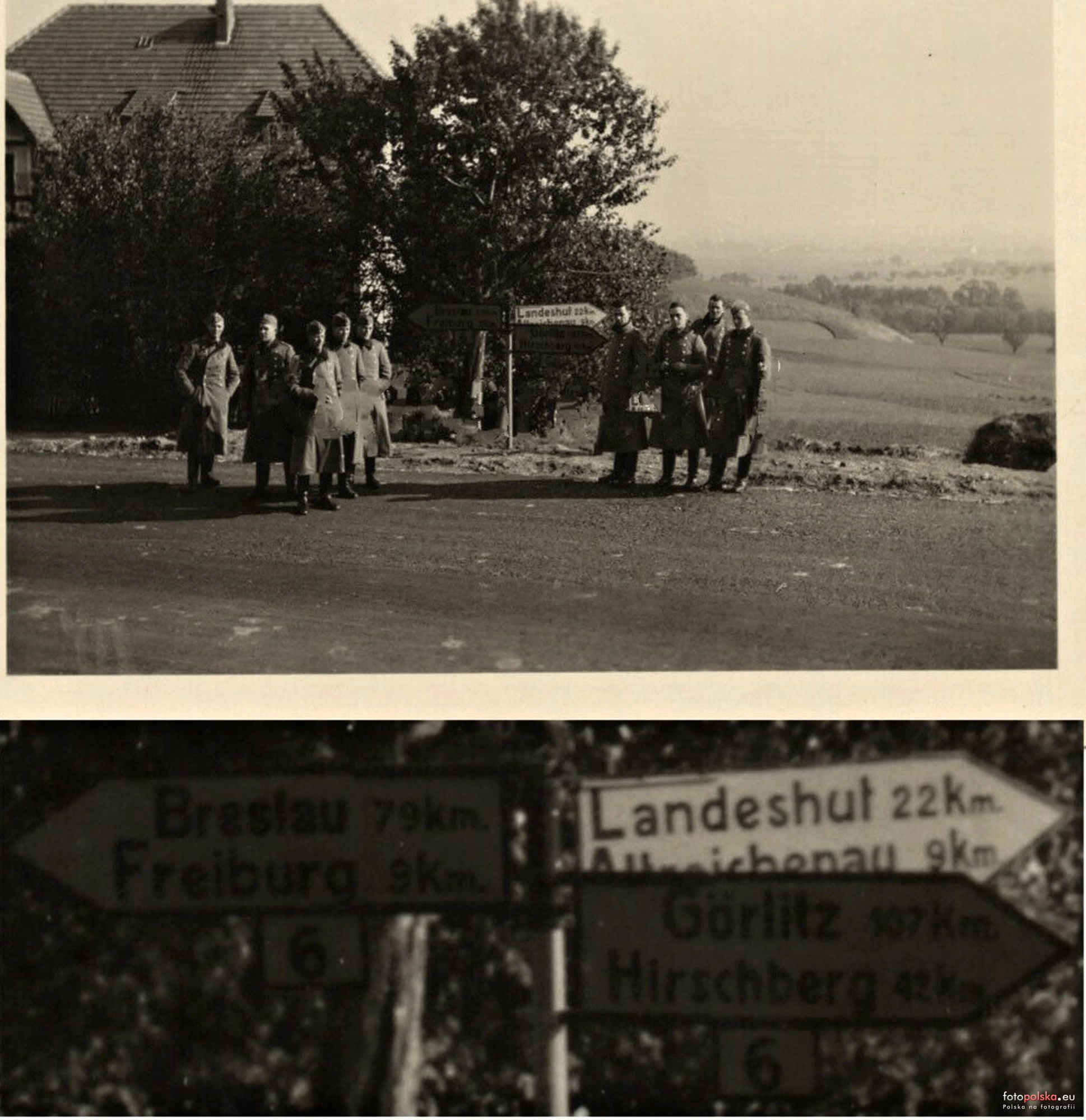 Lata 1935-1940 , Fotografia wykonana na dawnej drodze nr 6 z drogowskazem Wrocław 79 km, Freiburg (Świebodzice) 9 km, Landeshut (Kamienna Góra) 22 km, Zgorzelec 107 km, Jelenia Góra 42 km. W tle budynek Chrobrego 18.Skomentuj zdjęcie