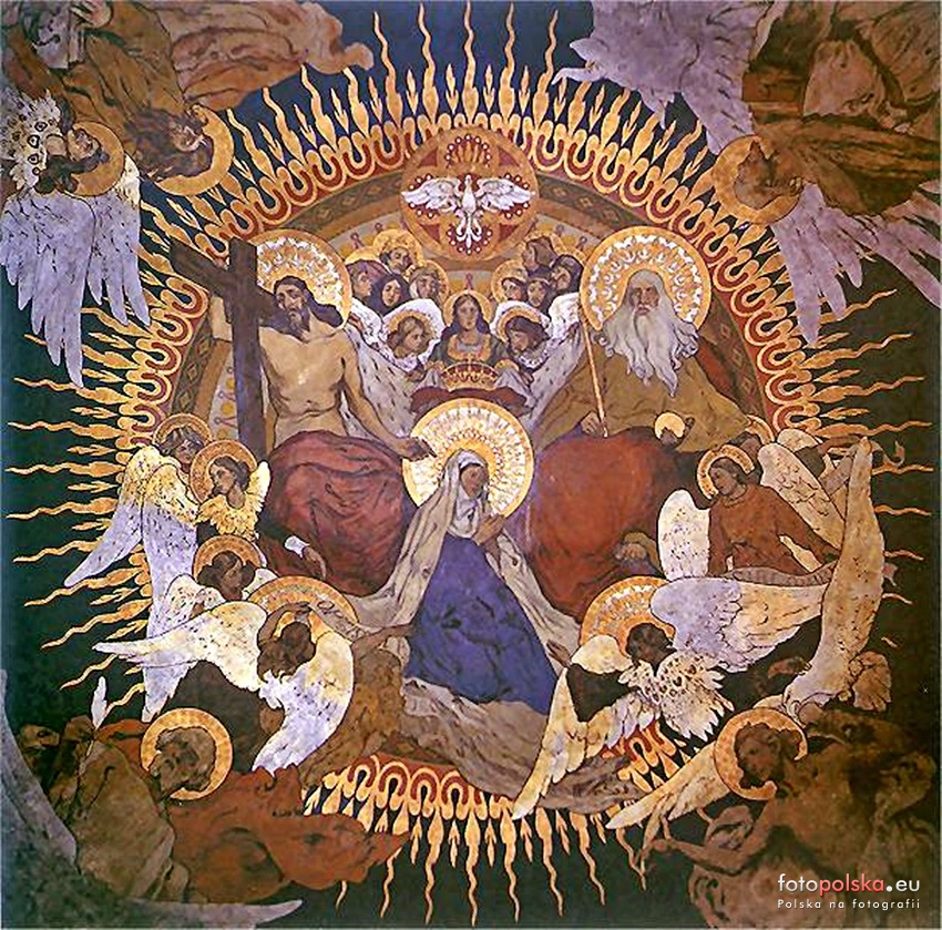 Polichromie - freski – sceny z historii Polski, wykonane przez Włodzimierza Tetmajera i Henryka Uziembło (przyrodniego brata poety), na zlecenie Ks. Milberta, składające się z 14 scen o treści historyczno-religijnej oraz wizerunków 62 świętych, we wnętrzu katedry. Artyści skomponowali dzieło podporządkowane układowi liturgicznemu świątyni. Elemwnty wdług nich - najważniejsze, umieścili wokół ołtarza głównego i na skrzyżowaniu nawy głównej z transeptem (nawą poprzeczną). Wykorzystali zasadę horror vacui (lęk przed pustką), czyli nie zostawili pustej przestrzeni, zatarli architekturę wnętrza dekoracją. Wszystkie sceny łączy ornamentyka roślinno-kwiatowa, która jednocześnie dopełnia łuki arkad, otworów okiennych, formę sklepienia i trójstrefową kompozycję ścian świątyni.