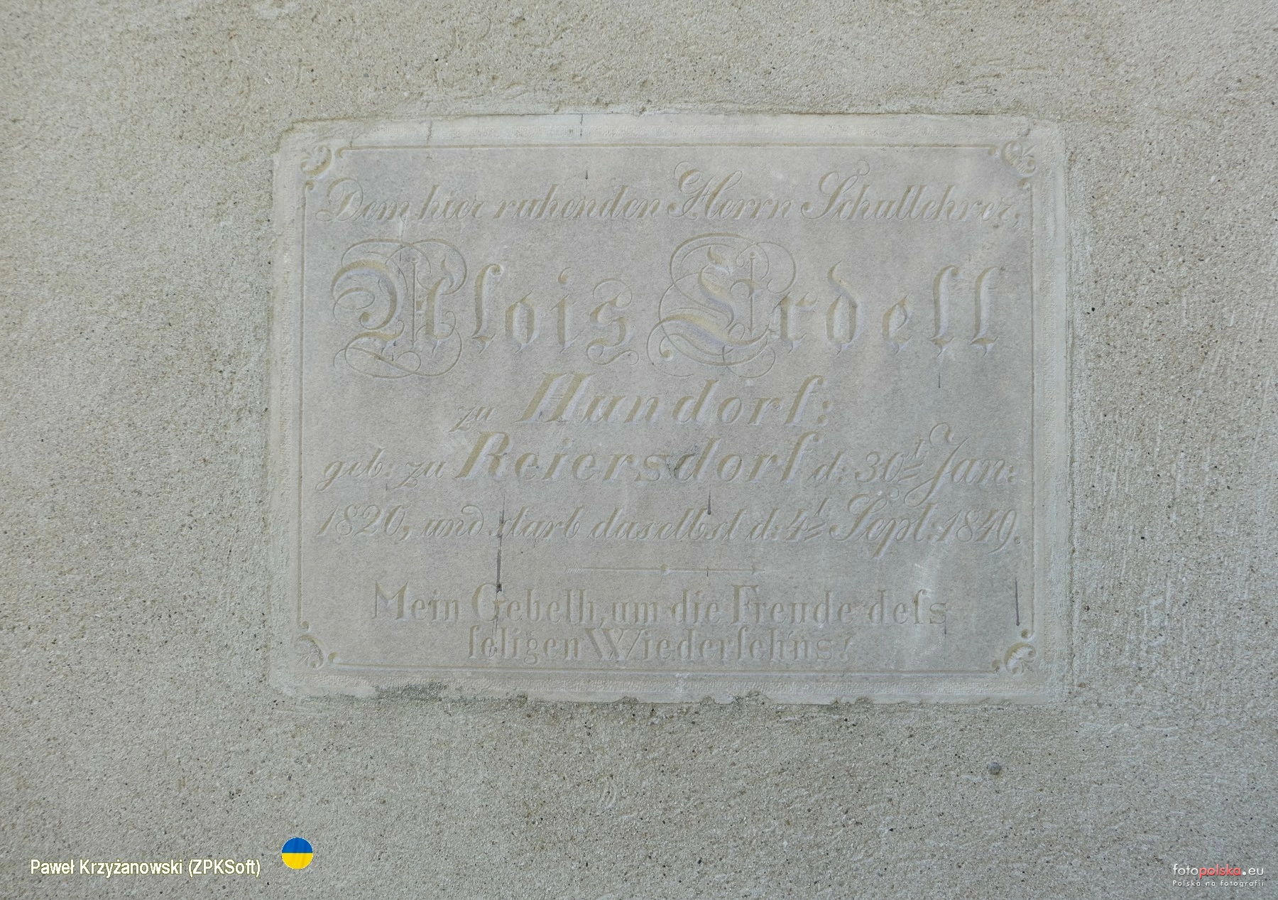 27 sierpnia 2022 , Epitafium na murze kościoła wskazujące, że Alois Erdell zmarł w 1849 r.Skomentuj zdjęcie |